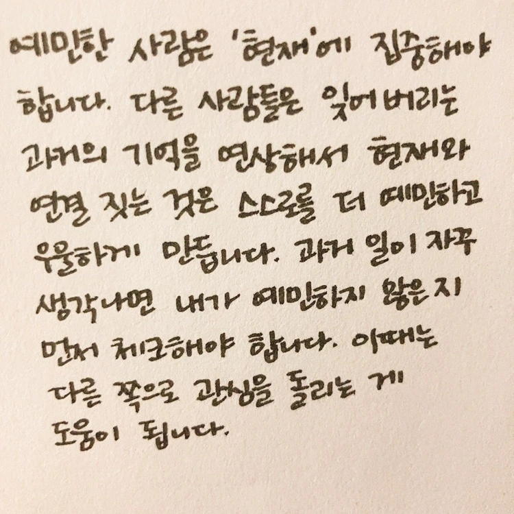 이런 비슷한 이야기를 인터넷에서 읽은 적이 있다. 너무 먼 미래나 과거를 생각하는 게 사람을 우울하게 만들 수도 있으니 현재에 집중해야 삶의 만족도가 높아진다는 이야기였다. 그런데도 자꾸만 과거에 얽매이게 되는 사람을 위한 조언으로 저자는 다른 쪽으로 관심을 돌리기를 권했다. 책을 읽는다든지, 그림을 그린다든지 뭔가 그 생각에서 벗어날 수 있는 행동을 함으로써 일단 생각을 한 번 끊어가는 게 중요하다고. 이 부분을 읽으면서 나는 과거 생각에 사로잡히고 있다는 걸 인지하면 곧장 뭔가 읽을거리를 집어야겠다고 생각했다.
