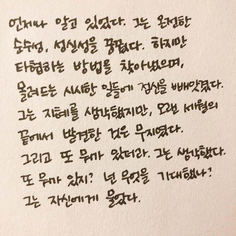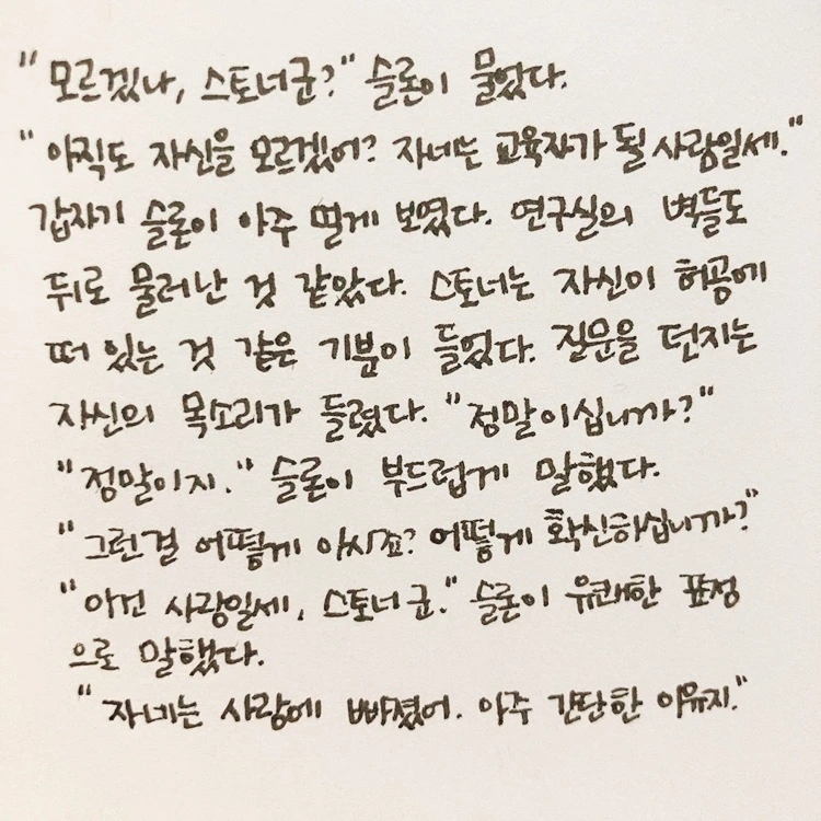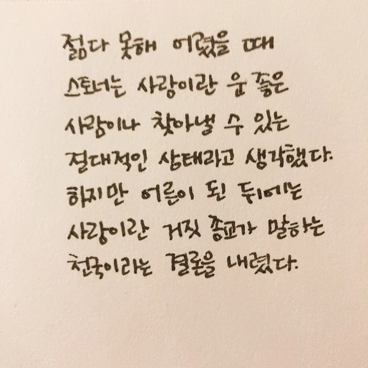 스토너는 초고속으로 진행했던 자신의 결혼이 실패했다는 걸 너무 일찍 알아차린다. 그러나 스토너는 그 결혼을 어떻게 해결하려 하지 않고, 묵묵히 견딘다. 나는 여러 번 답답해서 가슴을 치게 만들었던 사건들을 겪으면서도 묵묵히 견디며 자신만의 삶을 살아나간다. 그런 스토너가 내린 사랑의 정의라서 나에게는 아주 묵직하게 느껴졌다.