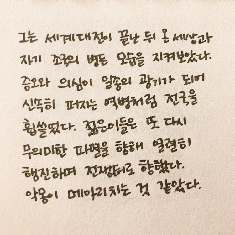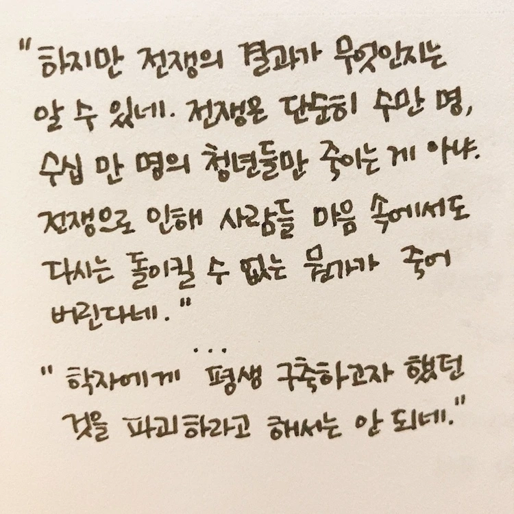 전쟁이 끝난, 혹은 멈춘 후의 삶에 대해 최근 1년 동안 생각할 기회가 여러 번 있었다. 전쟁을 직접 겪지 않았더라도, 단지 같은 시기를 살았던 사람들에게도 전쟁이 남긴 깊은 흔적을 보며 그 파괴력과 참혹함에 대해 다시 한번 생각했다.