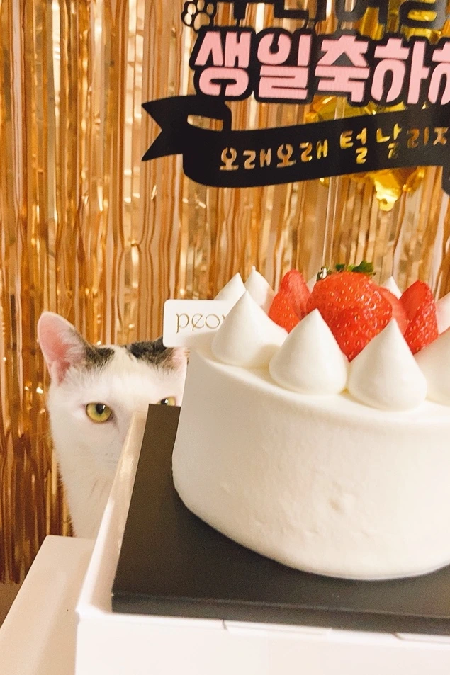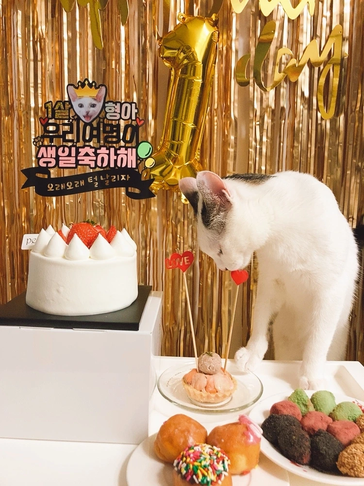 고양이 생일은 처음이라서 그냥 좋아하는 간식을 좀 더 챙겨주고, 좋아하는 장난감으로 더 오래 놀아주면 되겠거니 하고 있었다. 그래도 첫 생일인데 케이크는 하나 있어야 할까 하고 고양이 생일파티를 검색하기 시작했다. 다양한 물품들과 후기들을 읽으면서 나는 점점 미안한 마음이 들기 시작했다. 여명이는 태어나서 처음 맞는 생일인데 내가 너무 안일하게 생각한 것 같았다. '그래도 이건 너무 과한가'와 '그래도 첫 생일인데' 사이에서 내가 갈팡질팡하는 동안 판이 점점 커지고 있었다. 결과적으로 사람 가족에게도 해준 적 없는 파티 현장이 되고 말았다. 평일이라서 아무도 부를 수가 없어서 둘만의 조촐한 파티가 될 예정이었는데, 어쩌다 보니 조촐하지 못한 상황이 되었다.