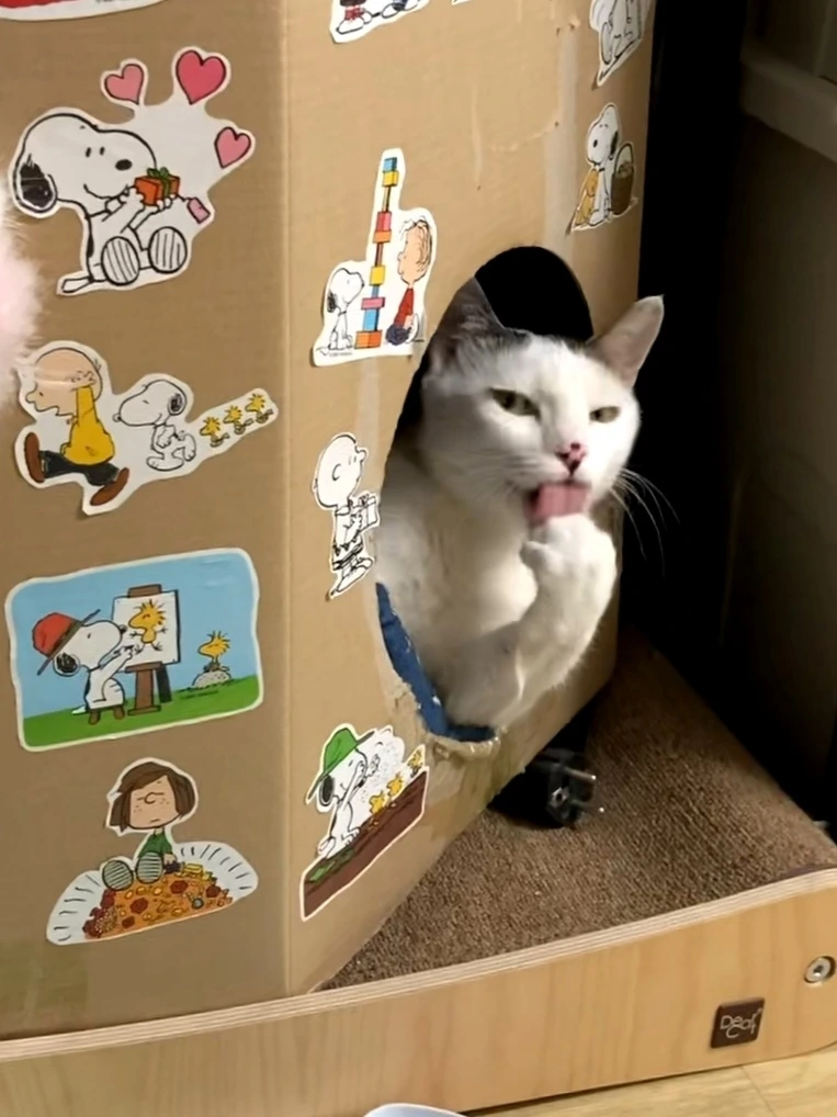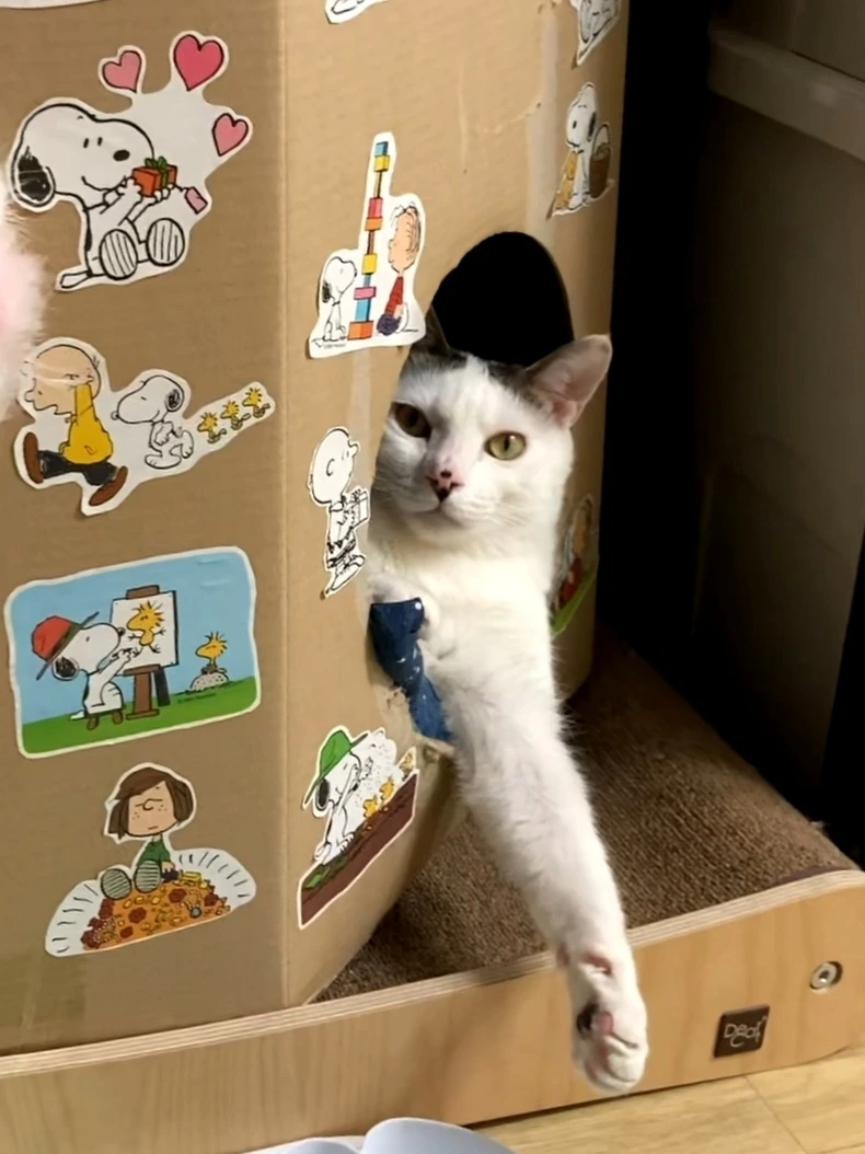 여명이가 놀자고 보채기 전에 나에게 보내는 사인이 있다. 내가 지난 일력으로 꾸며준 종이 숨숨집 안에서 잠을 자다가 슬금슬금 머리를 밖으로 빼고 나를 쳐다보기 시작하면 놀고 싶어진 거다. 아직 머리만 나와있을 때는 살짝 모르는 척해도 되지만, 다리 하나가 더 나오면 더는 무시하기가 어렵다. 한쪽 팔로 운전하는 아저씨처럼 여명이는 한쪽 다리를 숨숨집 밖으로 빼고 나를 한참 쳐다본다. 보통은 저 시선이 점점 부담스러워질 때쯤 내가 못 이기는 척 놀자고 해주지만, 계속 모르는 척하면 어떻게 될지 궁금해서 버텨본 적이 있다. 등을 돌리고 앉아서 여명이 몰래 숨숨집 쪽을 촬영하고 있었더니 여명이는 꼭 무기 관리를 하는 것처럼 앞발 그루밍을 시작했다. 그루밍을 싹싹하더니 밖으로 나와서 나한테 슬슬 다가왔다. 내가 이제 그만 찍고 도망가야 하나 고민을 시작하기가 무섭게 여명이는 싹싹 그루밍한 앞발로 내 등을 팍 쳤다. 체중을 실어서 제법 야무지게 치는 여명이를 보면서 앞으로는 절대 무시하지 말아야겠다고 생각했다.