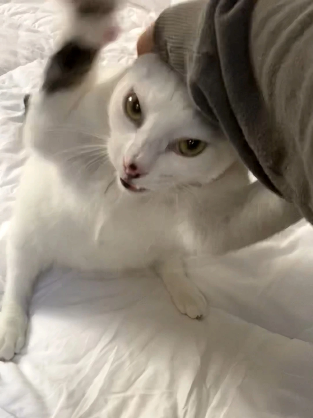 그때부터 놀이가 시작되는데, 여명이는 물고 나는 떼어내는 단순한 방식으로 거의 30분을 논다. 매번 그렇게 노는데 한 번도 나랑 여명이가 격렬하게 놀고 있다는 생각은 해본 적이 없다. 그런데 생각보다 우리가 박진감 있게 놀고 있다는 건 우리 둘이 노는 장면을 동생이 캡쳐한 걸 보고 알았다. 나름 다정하게 깔깔 웃으면서 놀고 있었는데, 웃고 있었던 건 나뿐이었나 싶어서 충격을 받았다. 사진마다 여명이는 눈을 세모로 뜨고 전력을 다해서 나랑 치고받는 중이었다. 무는 것도 그렇게 세게 물지 않았고, 내가 밀어내는 것도 살살 머리를 떼어내는 정도였는데, 캡쳐로 보니 여명이는 둘도 없는 맹수고 나는 고양이 학대범 같은 느낌이었다. 앞으로는 좀 더 강도 조절을 해야겠다 싶었다.