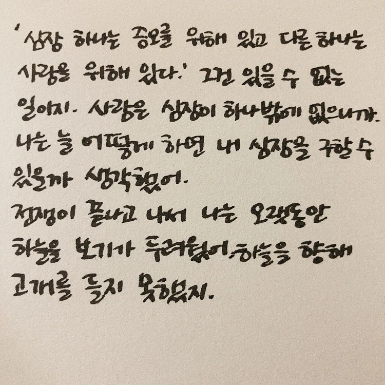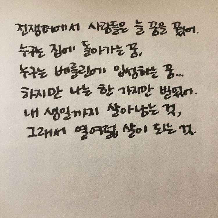 전쟁의 끔찍함은 전쟁이 끝난 후에도 상처가 계속 남아서 사람들을 괴롭힌다는 데 있다. 전쟁이 끝나고 나서도 한참 동안 하늘을 보지 못했다는 저 사람은 결국 자기 심장을 구할 수 있었을까, 이제 하늘을 볼 수 있을까 하며 계속 마음에 걸렸다. 한 사람의 모든 걸 송두리째 바꿔놓을 수 있다는 걸 한참 읽었더니 이제는 전쟁을 단순한 하나의 역사적 사건으로만은 볼 수가 없게 되었다.