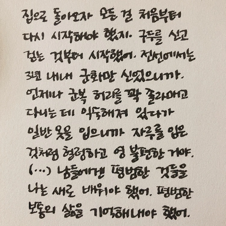 전쟁이 끝났다고 해서 바로 예전의 삶으로 돌아갈 수 있는 건 아니었다. 사람들은 전쟁에 익숙해진 모든 걸 다시 되돌리거나 처음부터 다시 배워야 했다. 책을 읽는 내내 요즘 전쟁으로 고통을 겪고 있는 우크라이나 사람들을 떠올렸다. 다시 평소처럼 살 수 있게 되기까지 얼마나 걸릴까. 돌아갈 수 있을까. 그러다가 얼마 전 봤던 피난소의 우크라이나 아이들과 불안한 표정의 주인아저씨 품에 안겨서 스트레스로 개구호흡을 하던 고양이 모습이 떠올라서 한참 마음이 아팠다. 예전 같았으면 폭격을 맞은 도시의 참상 같은 것들에 더 충격을 받았을 텐데, 이 책을 읽고 나서는 전쟁을 겪어내고 있는 사람들 모습을 먼저 보게 되었다.