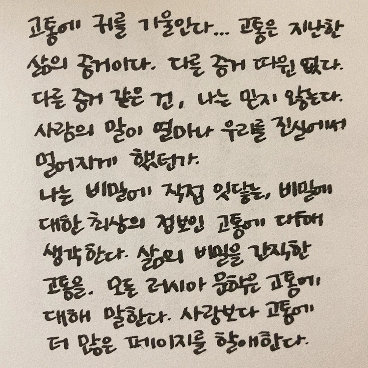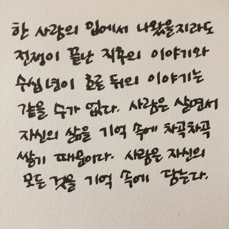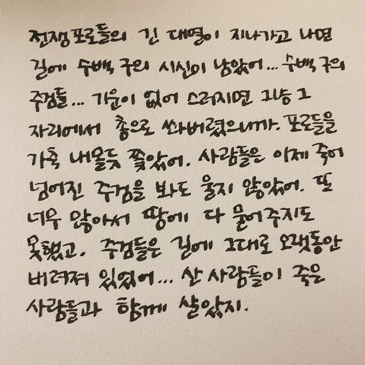 처음에는 전쟁 경험에 대해 말을 아끼던, 혹은 아끼도록 강요받았던 사람들도 저자 앞에서 기억하고 있는 모든 것들을 이야기한다. 참전자의 말처럼 전쟁을 떠올리는 것도 끔찍하지만 아무도 기억하지 않아 기억에서 사라지는 게 더 끔찍하기 때문일 것이다. 저자가 신뢰하는 ‘고통’의 기억들이 500쪽 넘게 이어져서 책을 읽는 게 정말 쉽지 않았다. 왜 기억을 하는 것도 기억을 하지 않는 것도 끔찍한지 알 것 같은 기분이었다.