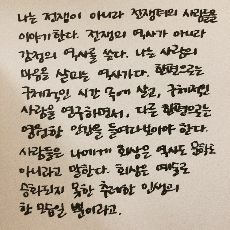 그동안 내가 거쳐 왔던 회사 중에는 전쟁기념관도 있다. 그곳에서 전시 콘텐츠들을 연구하면서 나는 여러 번 놀랐다. 전쟁의 역사가 너무나 길었고, 세계 곳곳에서 전쟁이 셀 수 없이 많았고, 사람이 사람을 해치려고 만든 무기가 징그럽게 다양하고 치밀했다. 내가 그래도 전쟁에 대해서는 제법 전문 지식을 갖추고 있다고 생각하며 책을 집었는데도, 읽으면서 또 충격을 여러 번 받았다. 너무 당연한 이야기지만 그동안 전술이나 피해규모, 의의 등으로만 알아왔던 전쟁은 사실 처음부터 끝까지 모두 사람의 일이었다. 숫자로만 파악했던 피해자들은 모두 이름이 있는 사람이었다. 그 사람들의 목소리가 담겨있어서 읽는 게 쉽지 않았다.