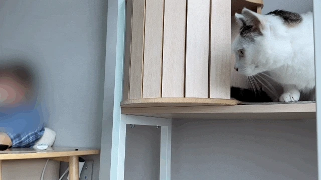 거실에서 서로를 의식하면서 의식하지 않는 척하며 시간을 보내는 모습은, 둘에게는 미안하지만 보는 사람한테는 약간 웃음 지뢰다. 그래도 딸이 키우는 고양이니까 관심을 조금 가져볼까 하며 최소 1미터 밖에서 장난감을 흔드는 아빠도 볼만하지만, 멀리서 흔들리는 장난감에 관심은 있어도 숨숨집 밖으로 나올 엄두는 안나는 여명이가 머리만 쭉 빼고 있는 모습도 만만치 않게 웃긴다. 거실에서 한참 그러고 있으면 둘 중 하나는 거리를 좁히려는 시도를 할 법도 한데 안전거리는 영 좁아지지 않는다. 그래도 한 때 아빠가 집에 있으면 방 밖으로 안 나오던 여명이를 생각하면 장족의 발전이기는 하다.