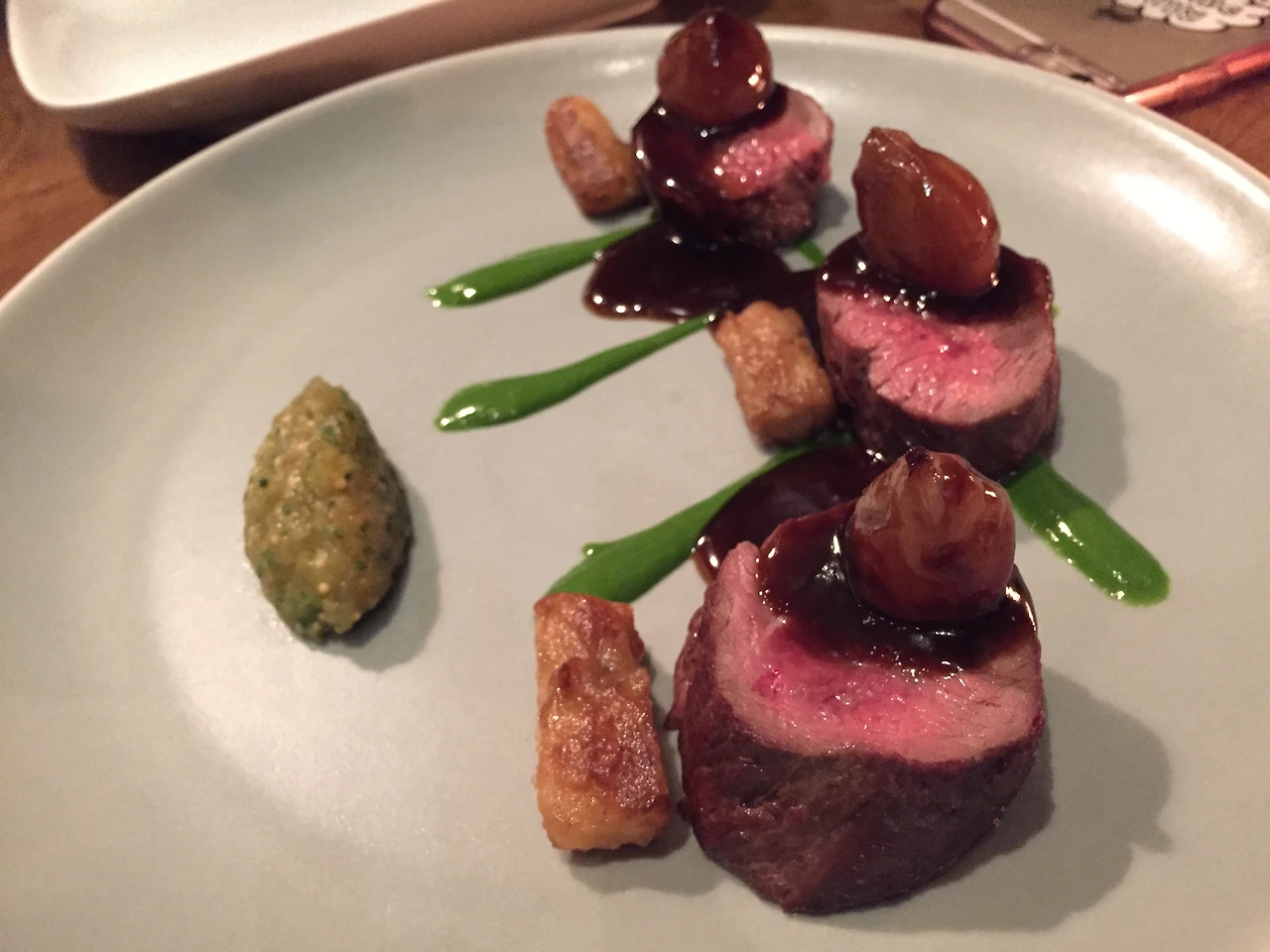 두 번째 메뉴는 Grilled Tenderloin이었다. 떡 튀김 처렁 생긴 저 튀김의 정체는 소 지방이었다. 아직 왜 지방을 튀겨서 줬는지는 파악하지 못했다. 소고기 위에 올려져 있는 알맹이들은 통마늘 절임(?)이었다. 소고기의 느끼함을 달래주기 위해 나온 것 같은데, 역시 의도는 파악하지 못했다.