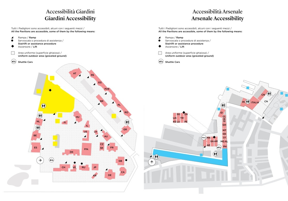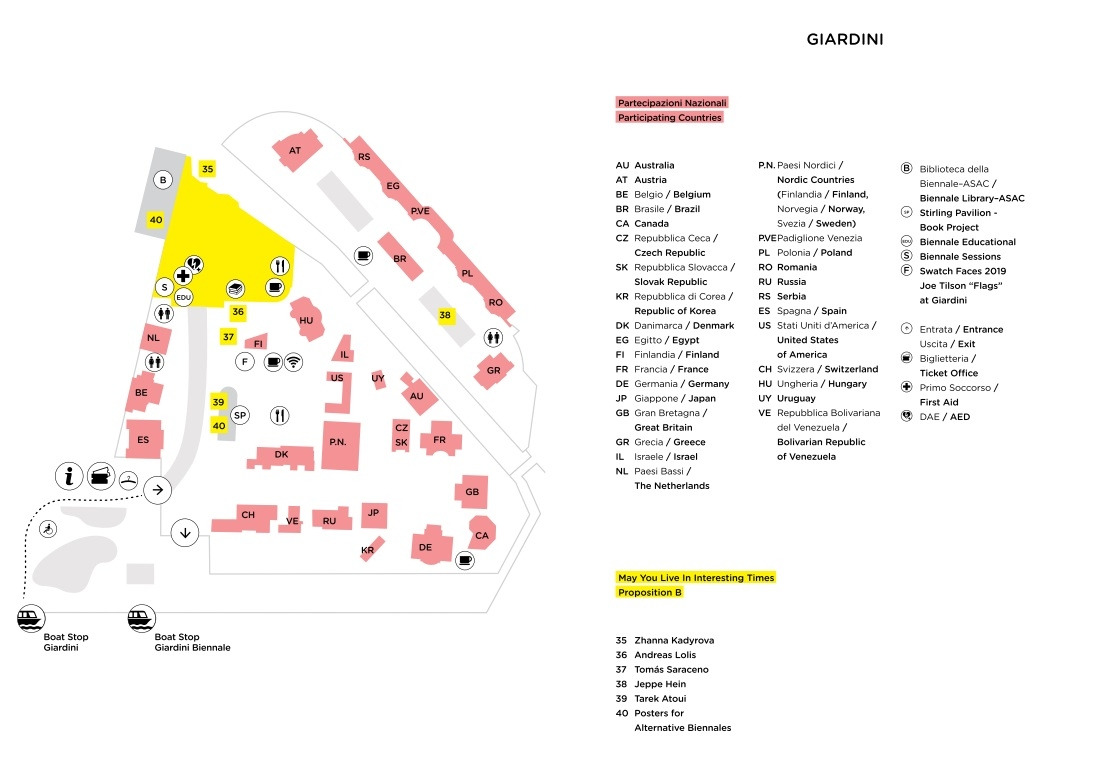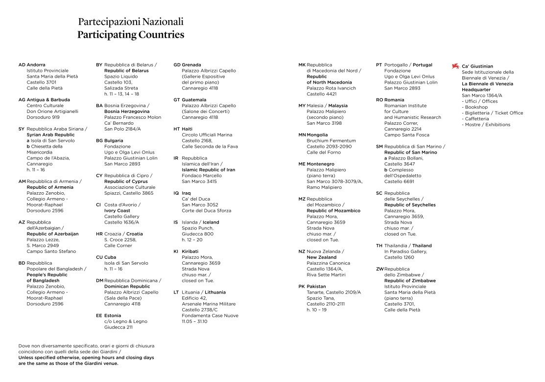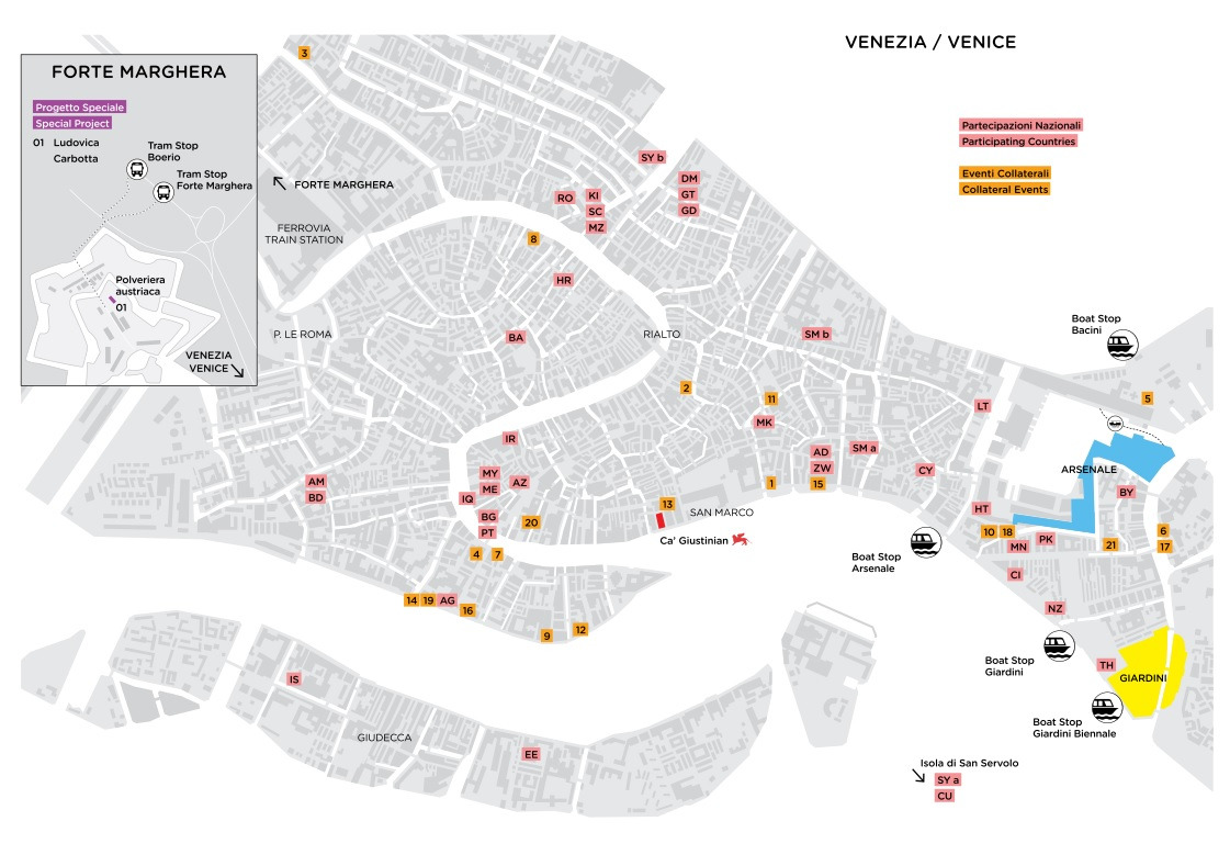 그리고, 베네치아 곳곳에 흩어져있는 국가관들자르디니, 아르세날레에서도 전시공간을 구하지 못한 나라의 경우 베네치아 본섬 곳곳에 흩어져서 전시를 진행하게 된다. 올해의 경우 첫 참여하는 4개국(가나, 마다가스카르, 말레이시아, 파키스탄)을 비롯하여 총 90개 국가에서 작품 전시를 진행한다. 나는 Ca' Giustinian 에는 꼭 방문 해 볼 예정이고, 90개 국가관 중 최고에게 주어지는 국가관 황금사자상을 수상한 리투아니아 Lithuania (주소 : Edificio 42, Arsenale Marina Militare Castello 2738/C Fondamenta Case Nuove)에도 가볼 예정이다.