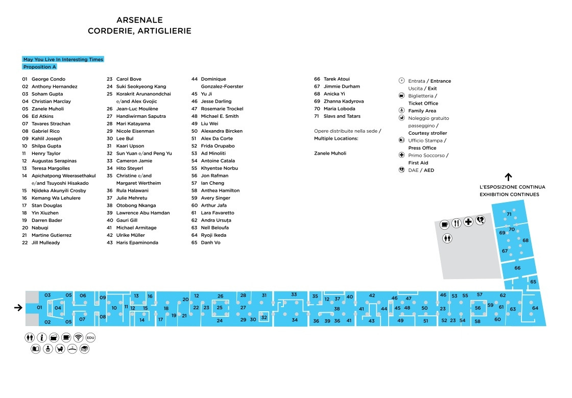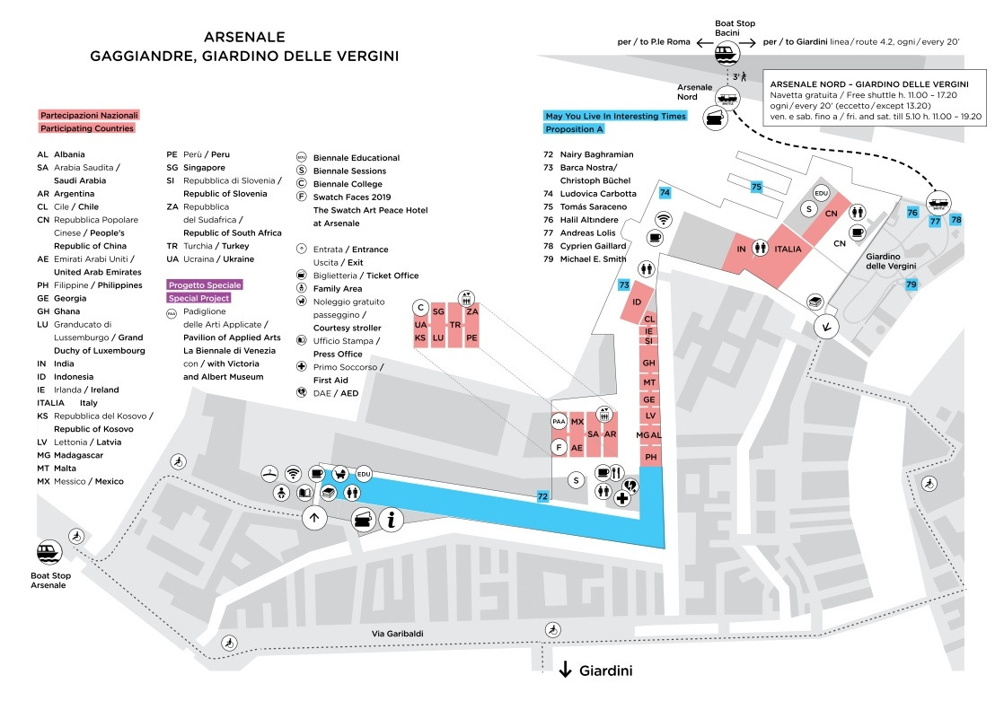 Arsenale 전시관도 크게 2가지로 분류 할 수 있다. 파란색(중앙관) / 분홍색(국가관)쉽게 말해서 자르디니(노란색)와 아르세날레(파란색)의 중앙관의 경우 메인 큐레이터 'Ralph Rugoff'가 제시한 주제 'May You Live in Interesting Times'에 관해서 초청작가 79명의 작품이 전시되는 공간이고, 국가관의 경우 각 국가별로 독립적으로 운영된다. 자르디니에 있는 국가관은 영구적으로 배정된 공간이지만 아르세날레 지역에 있는 국가관은 임대 형식으로 전시관이 사용된다. 나는 여기에서 이탈리아 관은 꼭 방문 해 볼 예정이다.