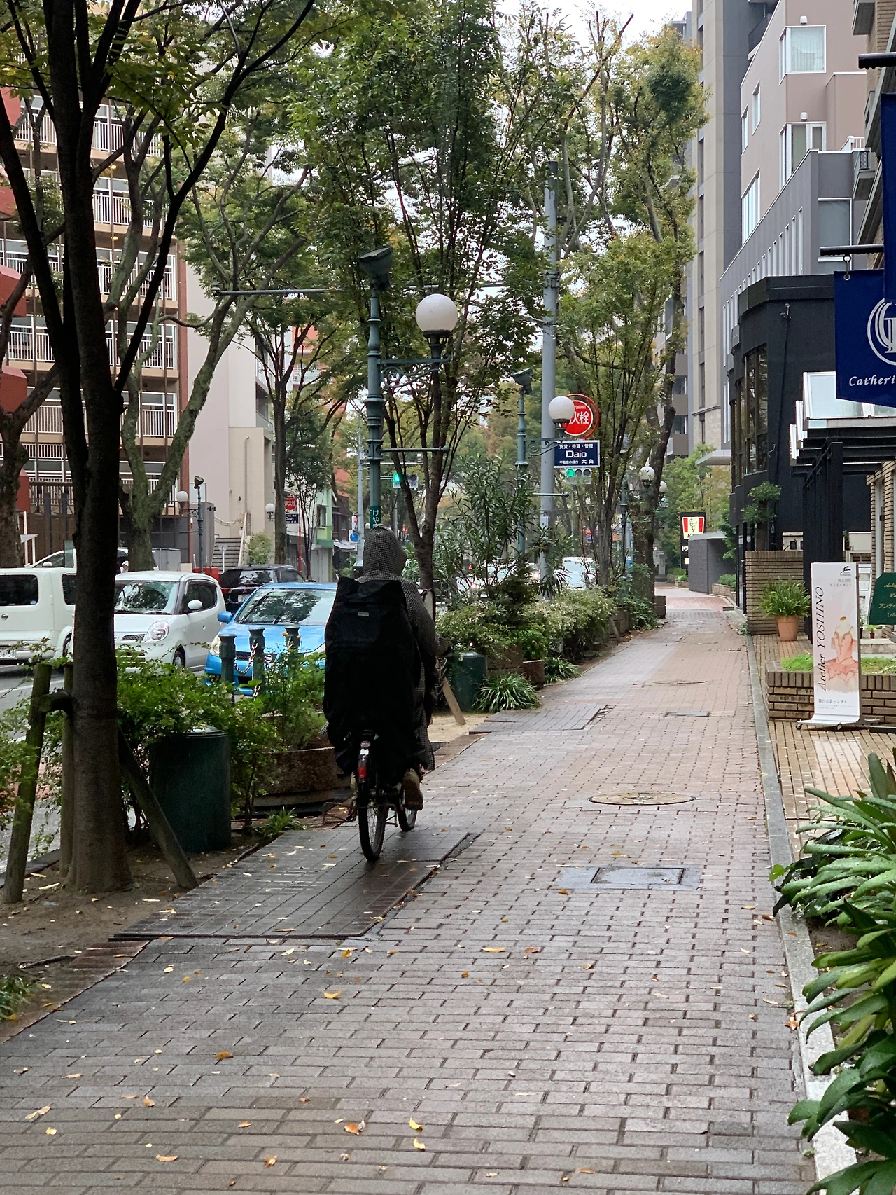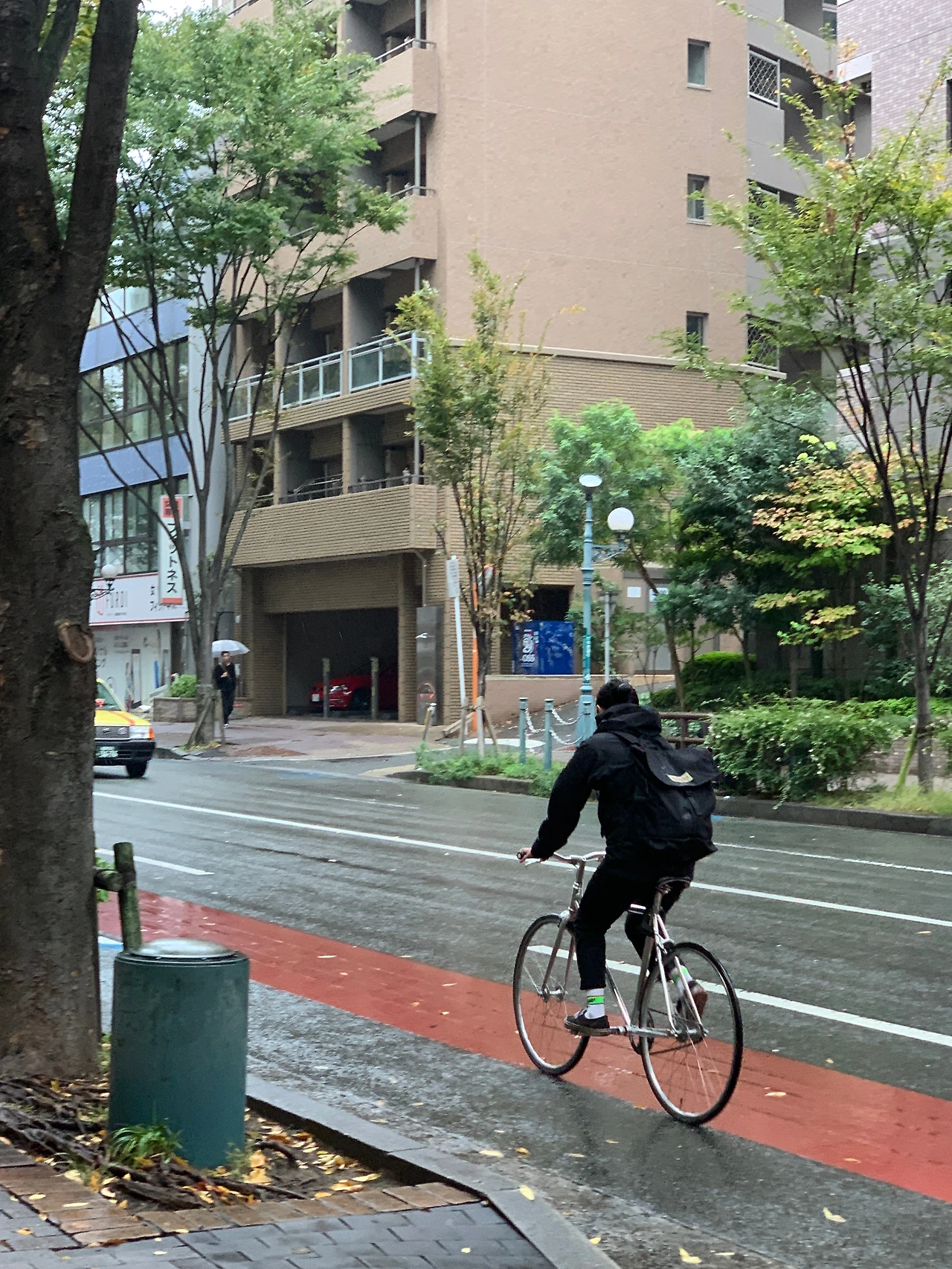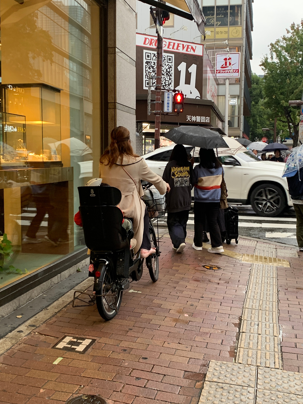 점심시간이 되어 비는 점점 더 내리기 시작해 멈출 기미를 보이지 않는다. 자전거를 반납하고 길을 걸으며 지나가는 사람들을 구경했다. 비가 와도 사람들은 아랑곳하지 않고 자전거를 탄다. 이것이 일본의 자전거 라이프인가. 후드 뒤집어쓰고, 어디서 났는지 우비도 걸치고 빗길을 쓱쓱 잘도 지나간다. 비가 와도 아이와 함께 자전거를 타는 모습도 신선하다. 비 맞으면 큰일이라도 나는 것처럼 극도의 염려를 하는 우리네 정서와는 사뭇 다른 느낌이다. 물론 비가 더 짙어질까 서둘러 가는 듯해 보였지만.