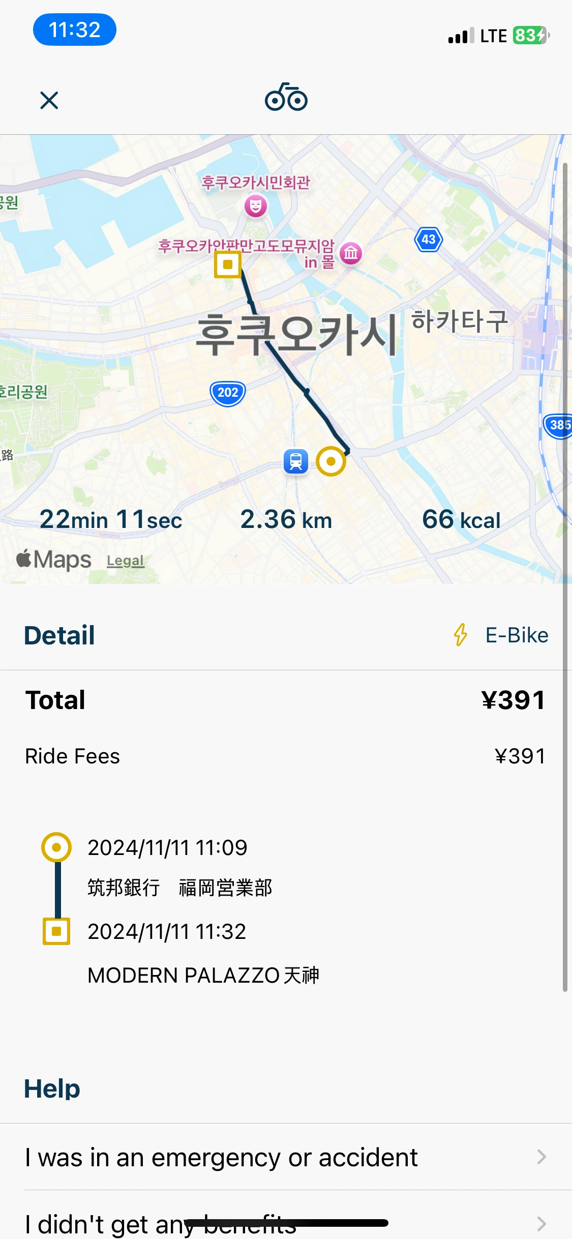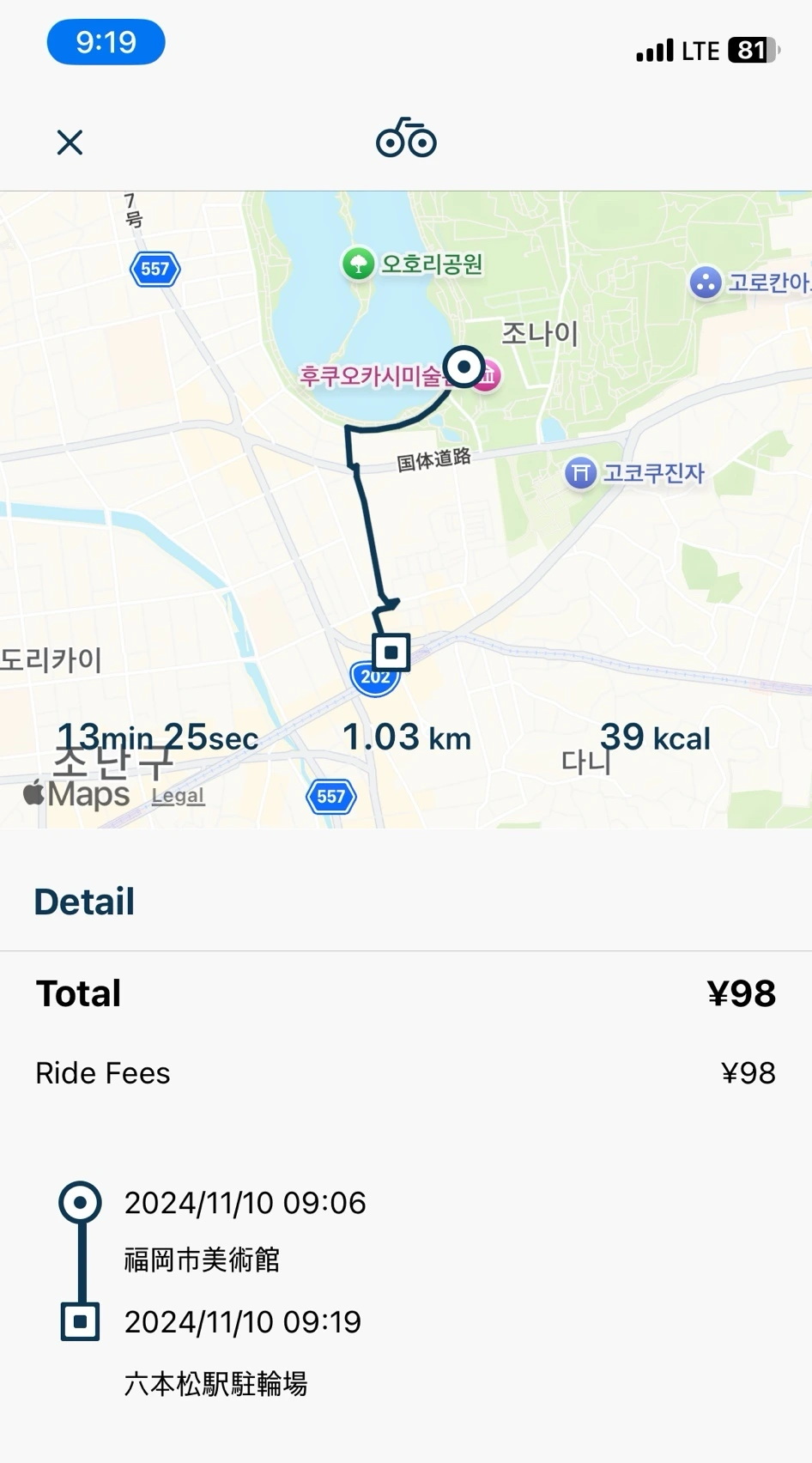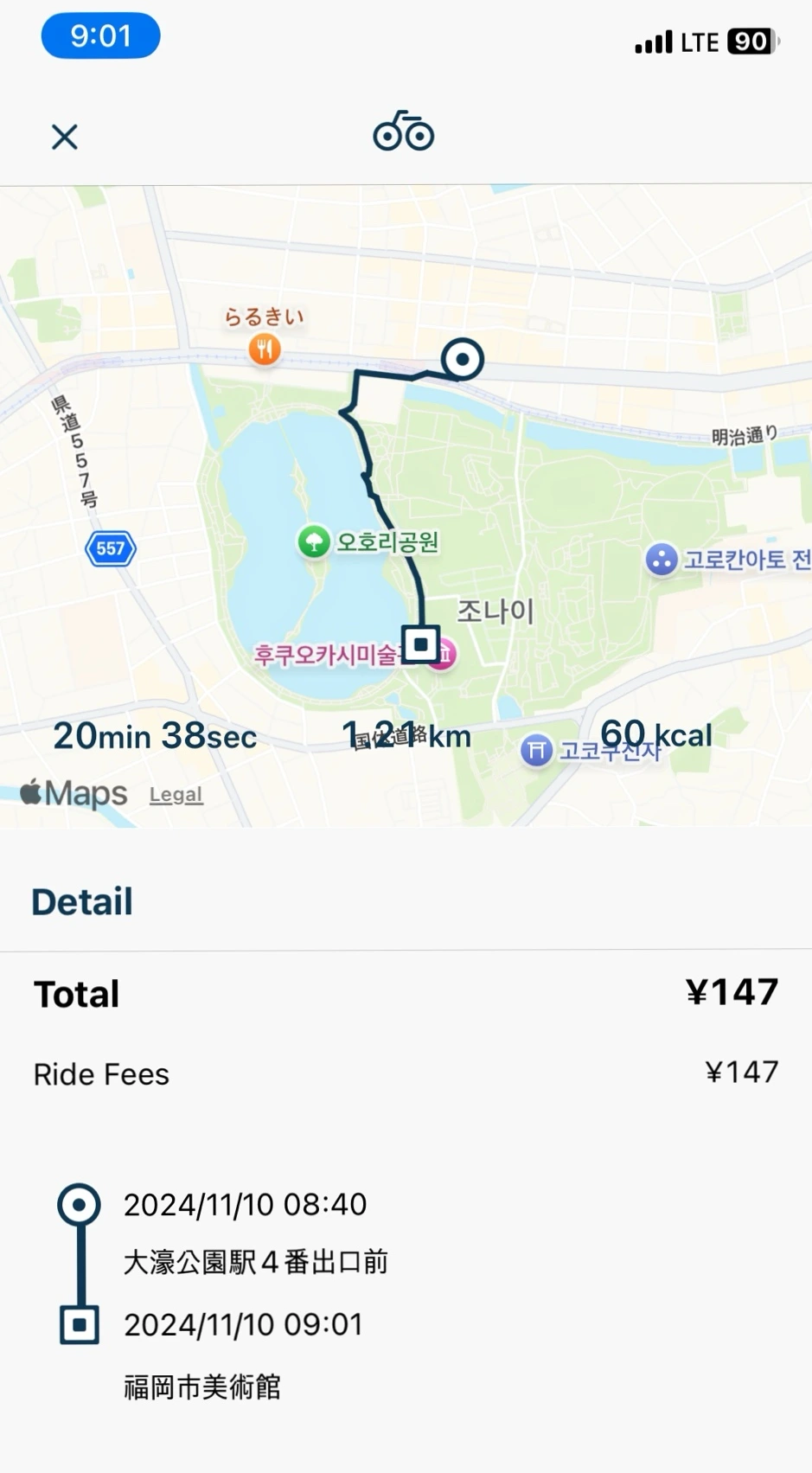 차리차리는 앱을 깔고 카드정보를 입력 후 대여하고자 하는 자전거의 QR을 스캔하면 lock이 풀려 바로 사용가능하다. 우리의 따릉이처럼 인기구간에서는 빌리기가 어려우나 조금만 더 걸어가면 근처에서 찾을 수 있다. 전기와 일반 2종류가 있는데 전기자전거의 사용료가 일반의 2배에 가까워 일반자전거의 인기가 더 좋다. 그럼에도 여행객의 입장에선 타 교통수단보다는 저렴하니 일반이나 전기나 가리지 않고 탔던 것 같다. 대부분 평지에다 작은 도시인 후쿠오카는 자전거도 다니기 정말 좋은 환경이다. 후쿠오카의 현지 바이브를 조금 더 느끼고 싶다면 차리차리를 이용해 보는 것을 추천한다.