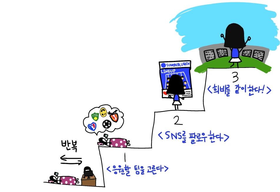 그런데 ‘라이트한 축구팬’ 되기는 너무 쉽다. 3단계만 실행하면 된다. 꼭 직접가서 볼 필요도 없다. 일상과 병행 가능한, 제일쉽게 시작할 수 있는 취미활동이다.