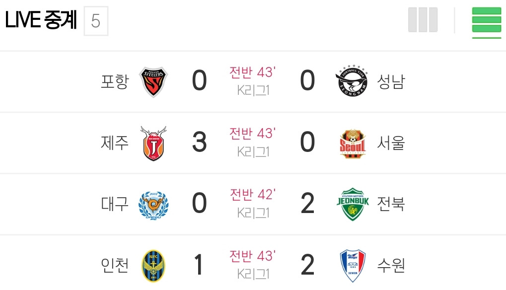 무심코 네이버 스포츠란을 넘겨보다가 까암~짝 놀랐다. 아니 아직 전반인데 모든 경기가 몇 골씩 들어가 있고 난리가 난 게 아닌가.