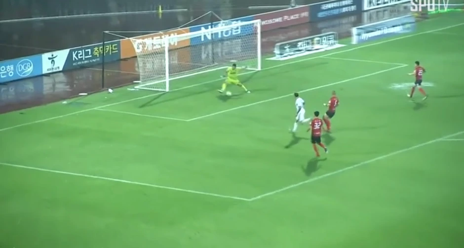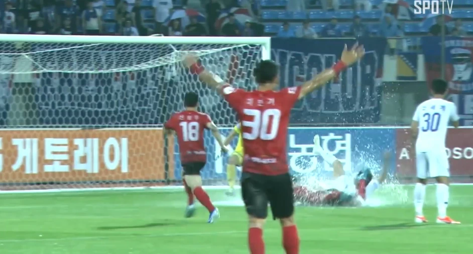 노동건 골키퍼가 길게 하프라인을 넘겨 차 준 공을 바그닝요가 받았고, 고민 없이 그 자리에서 장거리 슛을 날렸다. 상주 골키퍼가 민첩하게 쳐냈지만 튕겨나온 공을 타가트가 다시 차 넣어버린 것이다! 그리고 후반전에는 전반전 때보다 물웅덩이도 많이 작아져 있었다.