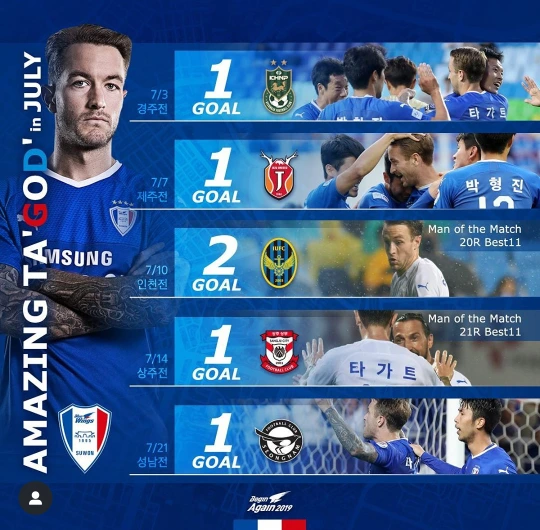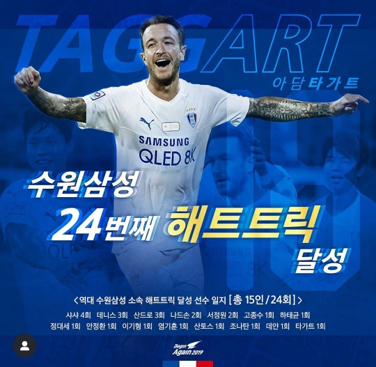 타가트는 호주 출신의 수원삼성 용병 선수다. 현재 K리그에서 16골로 득점 선두를 달리고 있다.