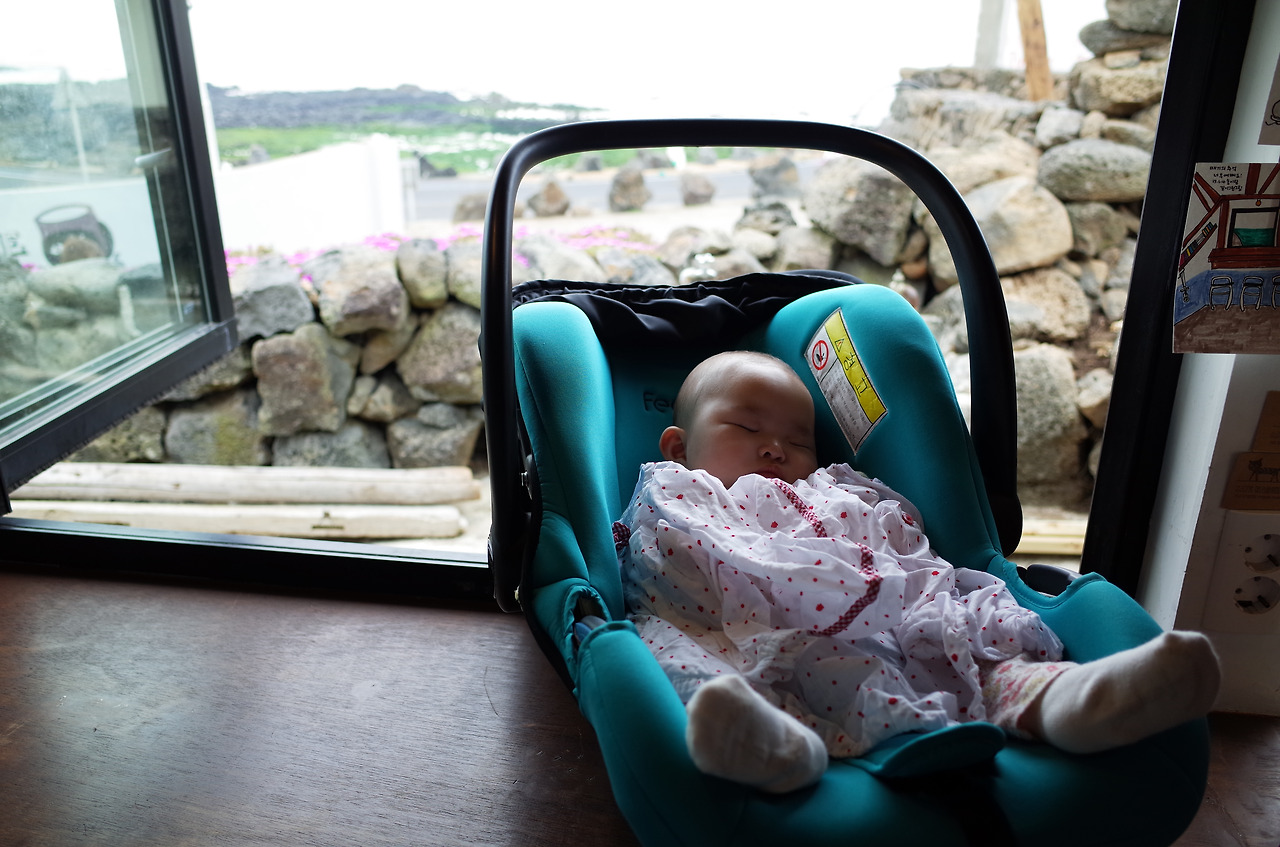 그렇게 순조롭게 우리의 첫 여행이 시작되었다. 미리 예약해둔 렌터카를 찾고, 추가로 유모차와 카시트까지 빌리니까 모든 준비가 완료. 공항을 벗어나서 해안가로 접어드니까 수인이는 카시트에서 평화롭게 잠에 빠져든다. 덕분에 아빠와 엄마는 맛있는 것을 마음껏 즐길 수 있었다. <꽃밥>에서 먹은 점심은 지금 또다시 생각날 정도로 정갈하고 맛있었고, 전에 혼자 갔던 카페 <매기의 추억>에서는 창 밖을 바라보며 평화롭게 커피도 한 잔 했다. 신혼부부처럼 둘만의 사진도 찍고. 날씨도 좋고, 마음도 평화로우니 특별한 무언가를 하거나 보지 않아도 참 좋고 편안한 시간이다.