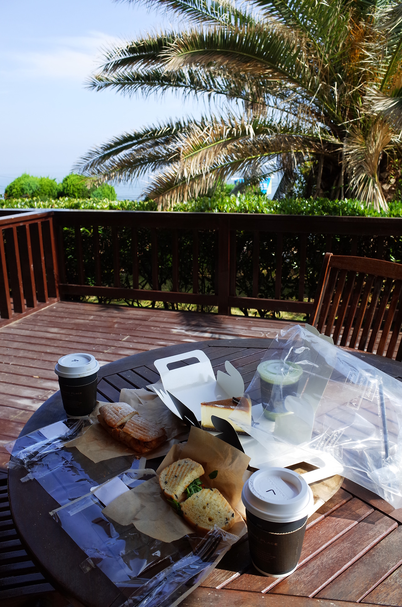 조식이 포함되어 있는 숙소인데 그 조식이 희한하게 카페의 음료와 샌드위치다. 카페 <투썸 플레이스>가 바로 옆에 붙어있는 숙소라 그곳이랑 뭔가를 하는 모양이었다. 사실 투썸은 서울에서는 굉장히 싫어하는 브랜드다. 쓸데없이 비싸고, 겉은 번지르르한데 맛이나 그런 건 특별히 맛있지도 않은, 딱 내가 싫어하는 우리나라의 이미지를 가진 그런 카페라서 싫어했다. 그런데 여기서의 투썸은 좋다. 어린아이를 데리고 어딘가로 조식을 먹으러 간다는 건 상상하기 어려운데, 카페 조식이라 가지고 와서 방에서 먹어도 된다는 점이 가장 마음에 들었다. 맛은 역시나 그럭저럭 이지만 무료고, 게다가 어제보다 더 좋은 날씨에 모든 것이 용서됐다. 방에 딸린 작은 테라스의 탁자에서 여유롭게 아침을 먹는 멋진 풍경 속에 우리 부부가 있었다.