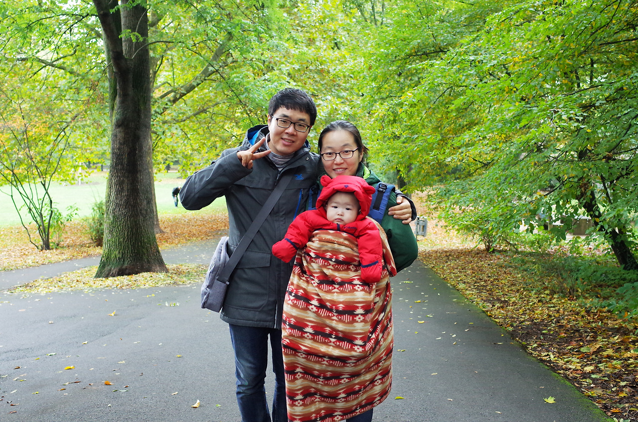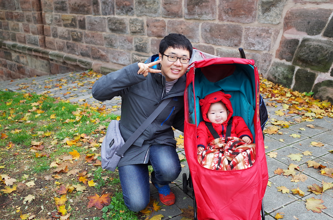 당연히(?) 답은 없다. 뭐가 신기한지 주변을 돌아볼 뿐, 그리고 유모차에 회장님 자세로 편하게 앉아있을 뿐. 일부러 유모차에서 꺼내서 가족사진을 한 번 찍어보았다. 독일에서는 앞으로도 함께 있을 시간이 많은 만큼 가족사진도 많이 찍어야겠다. 나중에 기억도 못할 수인이에게 사진으로나마 보여주려면. 아마 기억도 못하는데 무슨 말이냐며 약 오르겠지?