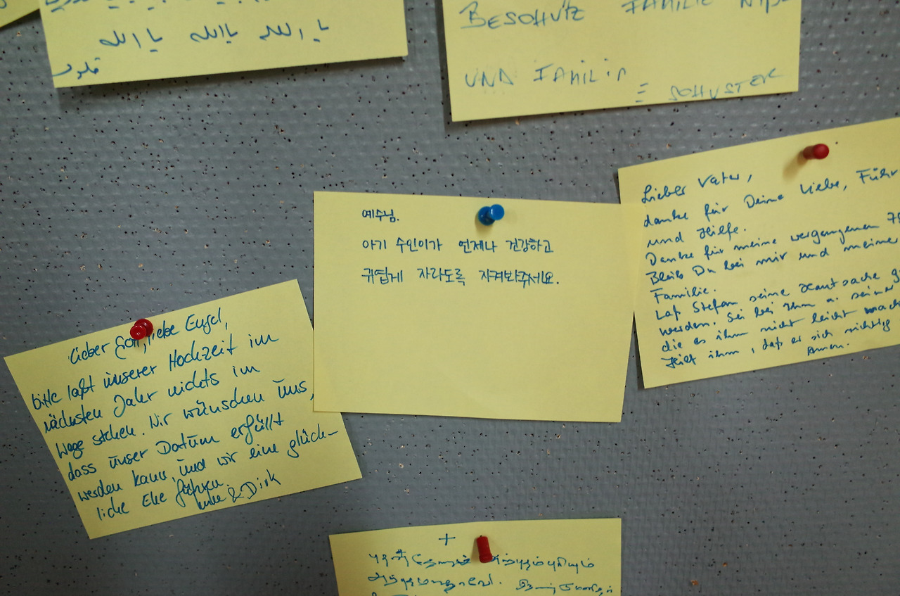 수인이가 잘 있어준 덕분에 산책이 쉽다. 유모차에서 잠에 들기도 했다가, 또 깨서 엄마 아빠와 놀기도 했다가 하면서 잘 따라와 줬는데 가끔은 무슨 생각을 하고 있을까 궁금하기도 했다. 새로운 곳이라는 것을 수인이도 알까? 성벽을 따라 걷기도 하고, 좀 더 안으로 들어가서 교회에도 가보고, 차가워진 몸을 녹이고자 테이크아웃 커피도 한 잔 하면서 뉘른베르크 구시가지를 돌아봤다. 계획이 없기에 부담도 없고 평화로운 산책이다. 역시 산책은 이래야 제 맛. 한 교회 안에는 메시지도 남겨두었다. 수인이가 앞으로 건강하고 예쁘게 자라는데 조금이나마 도움이 됐으면 한다. 당장 독일 여행부터 잘 마쳐야 함은 물론이다.