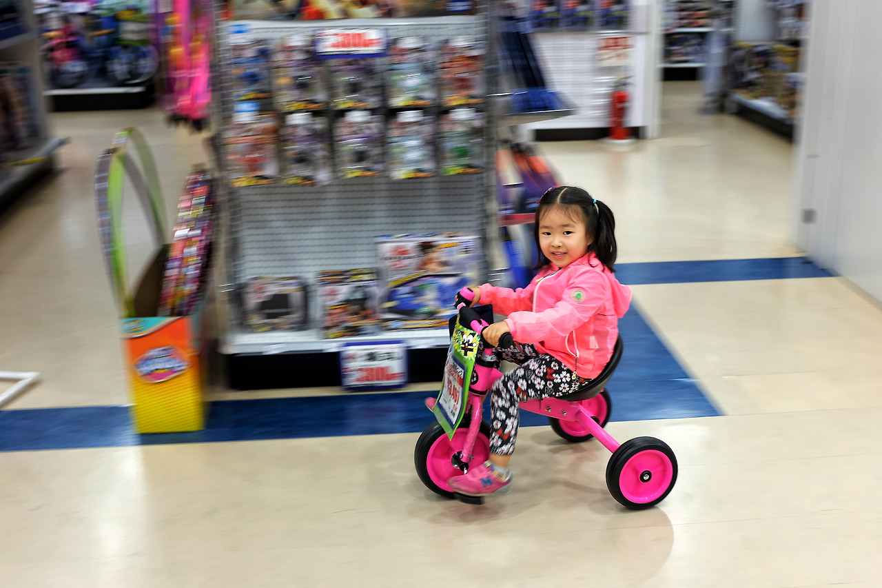 특히 많은 시간을 보낸 곳이 셋째 날 갔던 토이저러스였다. 일본 장난감을 보여주겠다며 데려갔는데 수인이는 갑자기 자전거에 꽂혀서 정말 한참 동안 샘플 자전거를 타고 매장 안을 돌아다녔다.
