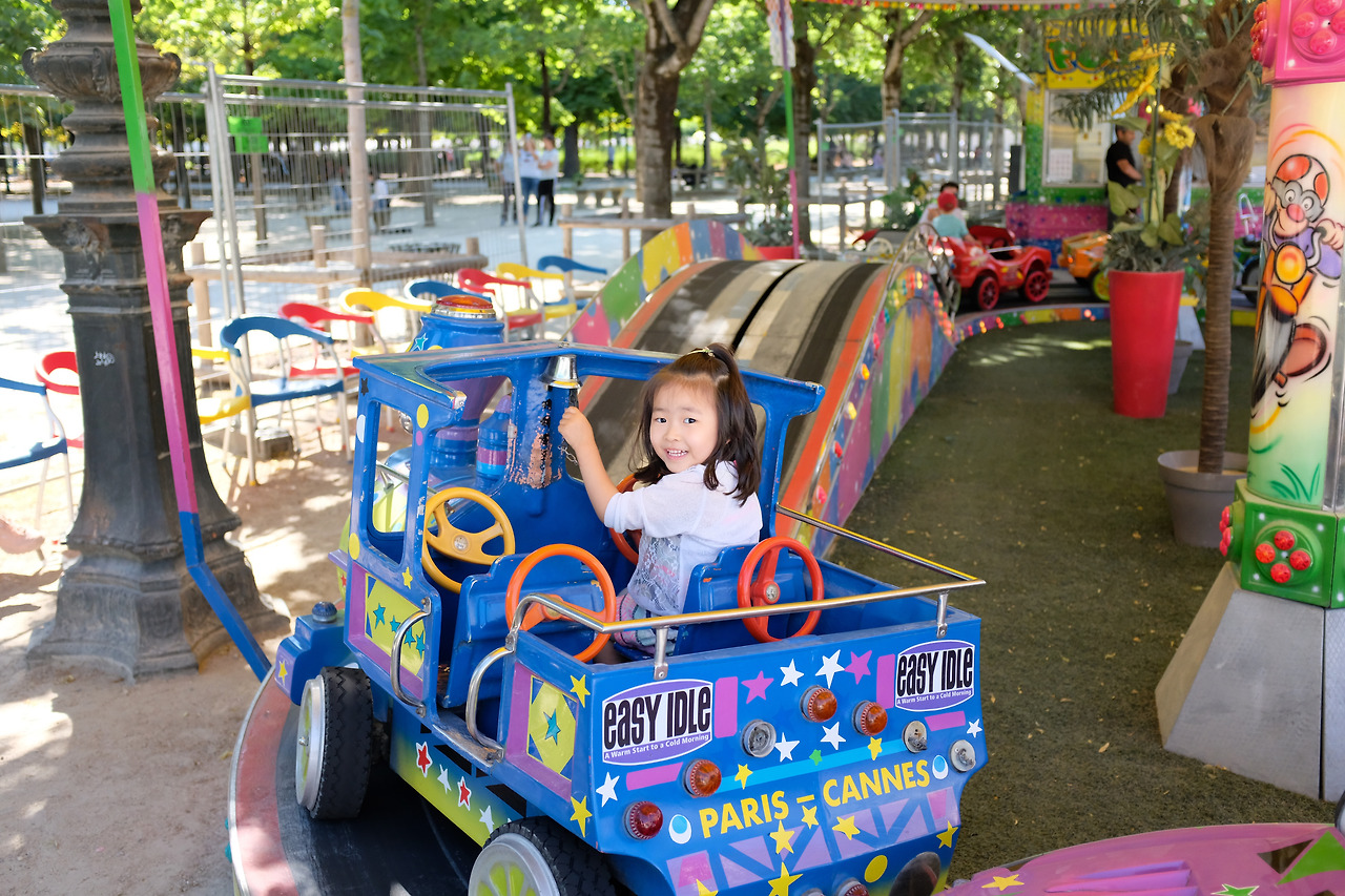 우리 가족 모두 함께 탈 수 있는 대관람차를 먼저 탔다. 파리 도심지 한복판에서 높이 솟아 보는 그 모습은 참 일품이었다. 원영이도 신나는지 두리번거리며 열심히 쳐다봤다. 한 바퀴만 도는 것도 아니고 여러 바퀴를 돌게 해주기 때문에 더 여유롭게 볼 수 있기도 했다. 멀리 사크레쾨르부터 가까이는 오르셰 미술관과 에펠탑까지, 주요 랜드마크들이 다 보였다. 그래 대관람차는 이 정도 풍경은 보여줘야지! 역시나 한 가지 옥에 티라면 1인당 요금이 12유로나 됐다는 점. 바르셀로나 티비다보 놀이공원에서는 2유로였는데. 무려 6배나 했다. 다른 놀이기구들도 다들 비쌌다. 그럼 그렇지. 파리는 좋다가도 뭔가 하나씩 아쉽다.