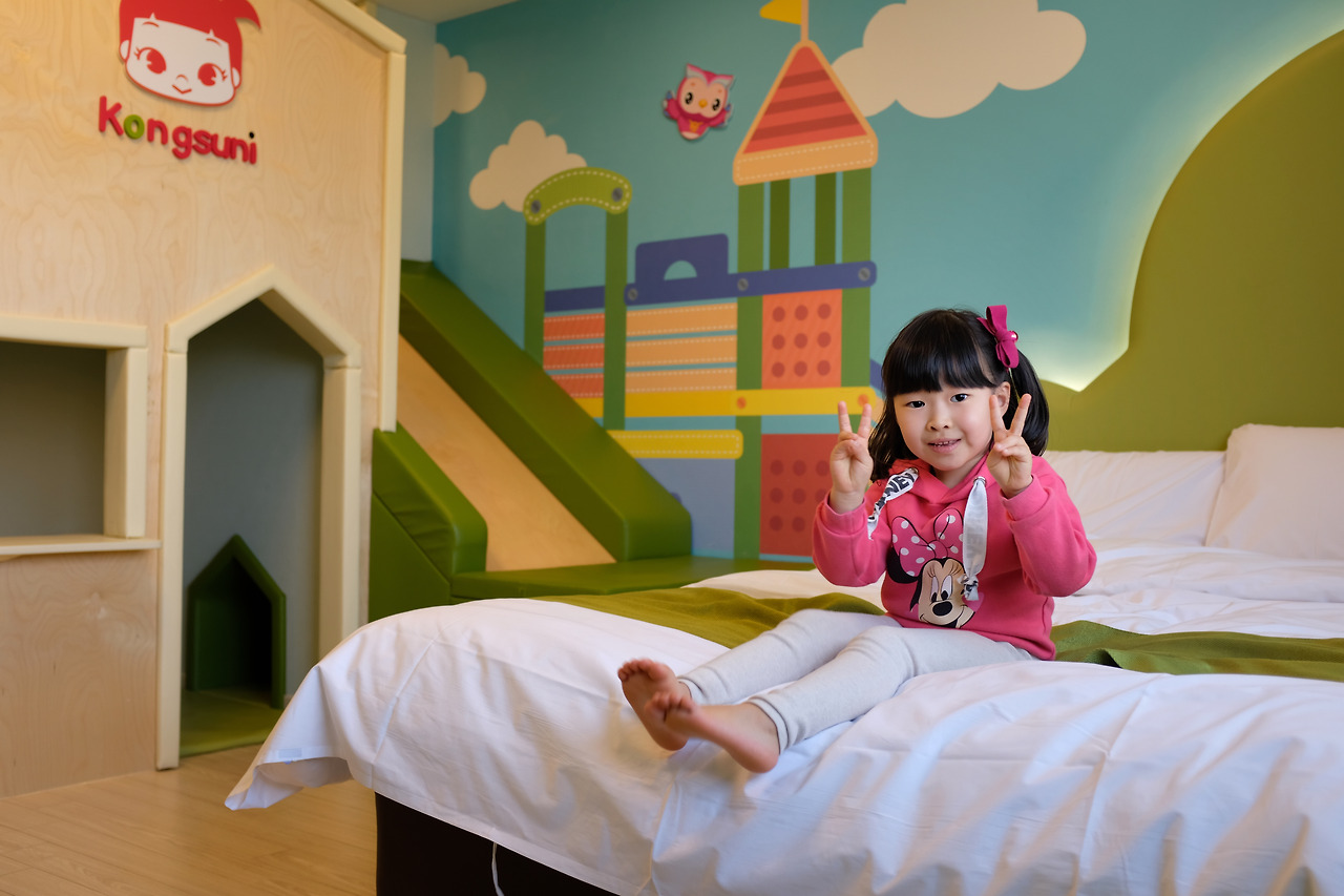 한 층에 콩순이, 시크릿 쥬쥬, 또봇 등 캐릭터룸이 모여있는데 우리가 선택한 건 콩순이. 사실 수인이랑 원영이가 콩순이 캐릭터를 그렇게 막 좋아하거나 그러진 않지만 방 안에 미끄럼틀이 있다는 이유가 가장 컸다. 다른 캐릭터룸에는 미끄럼틀이 없다. 우리 딸은 미끄럼틀 성애자라 모든 종류의 미끄럼틀을 가리지 않고 다 열심히 탄다. 그런데 집 안에 미끄럼틀이 있으니 얼마나 신났을까. 이 코로나 시국에. 다른 사람 신경 쓸 것도 없이 열심히, 정말 열심히 놀았다.