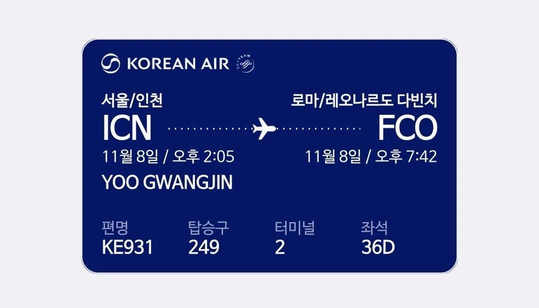 "손님 여러분, 이 비행기는 독일 프랑크푸르트까지 가는 아시아나 항공..."