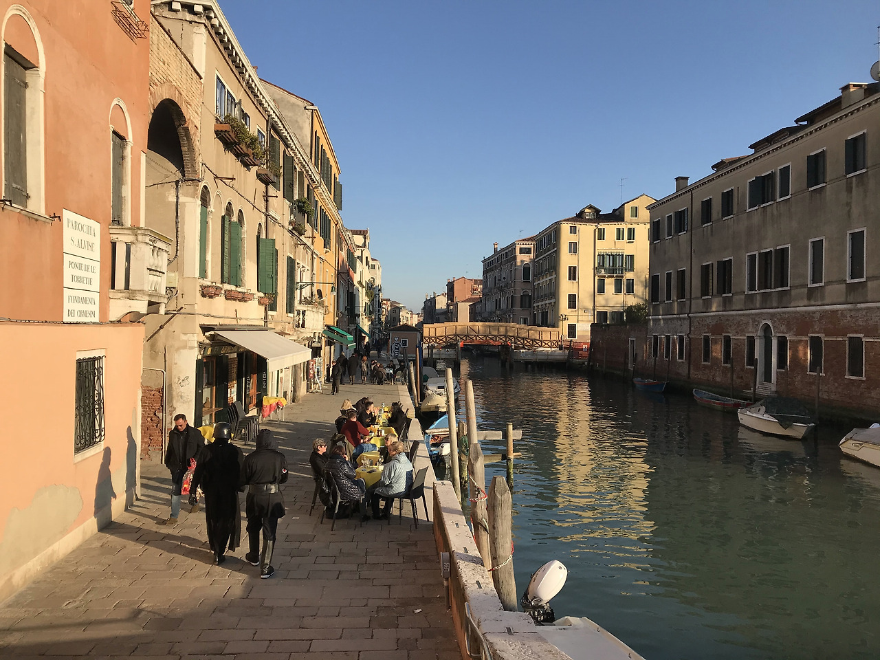 숙소는 본섬의 중심가에서 조금 떨어진 조용한 주거지역에 있었다. 체크인을 마치고 저녁 식사 전까지 시간이 남아서 일단 밖으로 나와 숙소 주변을 계획 없이 돌아다녔다. 숙소 바로 앞 수로를 따라 작은 가게들이 늘어져 있어 구경하는 재미가 있었다. 햇볕도 좋고 한적해서 딱 평화로운 오후 느낌! 그러다 웬 스타워즈 코스튬을 한 두 남자가 앞에 지나갔다. 그중 한 사람은 완전히 다스베이더 풀착장을 하고 당당하게 걸어가는 게 왠지 멋있기도 했다. 카니발 기간이어서 종종 코스튬을 한 사람들이 보였는데, 이들은 왠지 독특해서 나도 모르게 그 사람들을 따라갔다. 왠지 그 사람들을 따라가면 재밌는 무언가가 있을 것 같아서. 다스베이더가 내 앞을 스쳐 지나가는 순간이 슬로 모드로 아직까지 내 기억에 생생하다. 급한 약속이라도 있는 것처럼 휘적휘적 빠르고 큰 보폭으로 베니스 골목골목을 가로질러 가는데, 걸음이 어찌나 빠르던지 잠시라도 한눈을 팔면 저 멀리 가 있어서 살짝 뛰어야 했다. 베니스 골목길이 워낙 복잡해서 옆 골목으로 휙 가버려 내 눈에서 사라지면 잃어버리기 십상이다. 갑자기 그들이 나의 여행 안내자가 된 듯한 느낌이었다. 덕분에 혼자였다면 절대 가보지 못했을 베니스의 숨은 골목을 속속들이 가봤다. 그러다가 일반 집 같은 곳으로 쏙 들어가 버려 나의 미행(?)은 허무하게 끝났다. 기대했던 재미있는 무언가는 없었지만, 이 경험 자체가 엄청 즐거웠고 나를 베니스의 숨은 골목길로 안내해준 다스베이더에게 고마웠다. 이런 게 혼자 하는 여행의 재미구나! 이 무계획하고 돌발적인 여행이 너무너무 신났다.