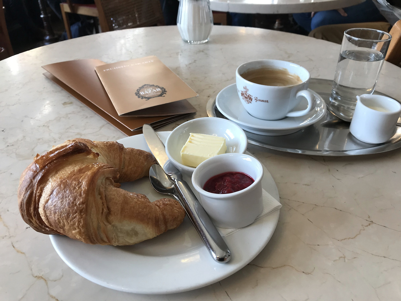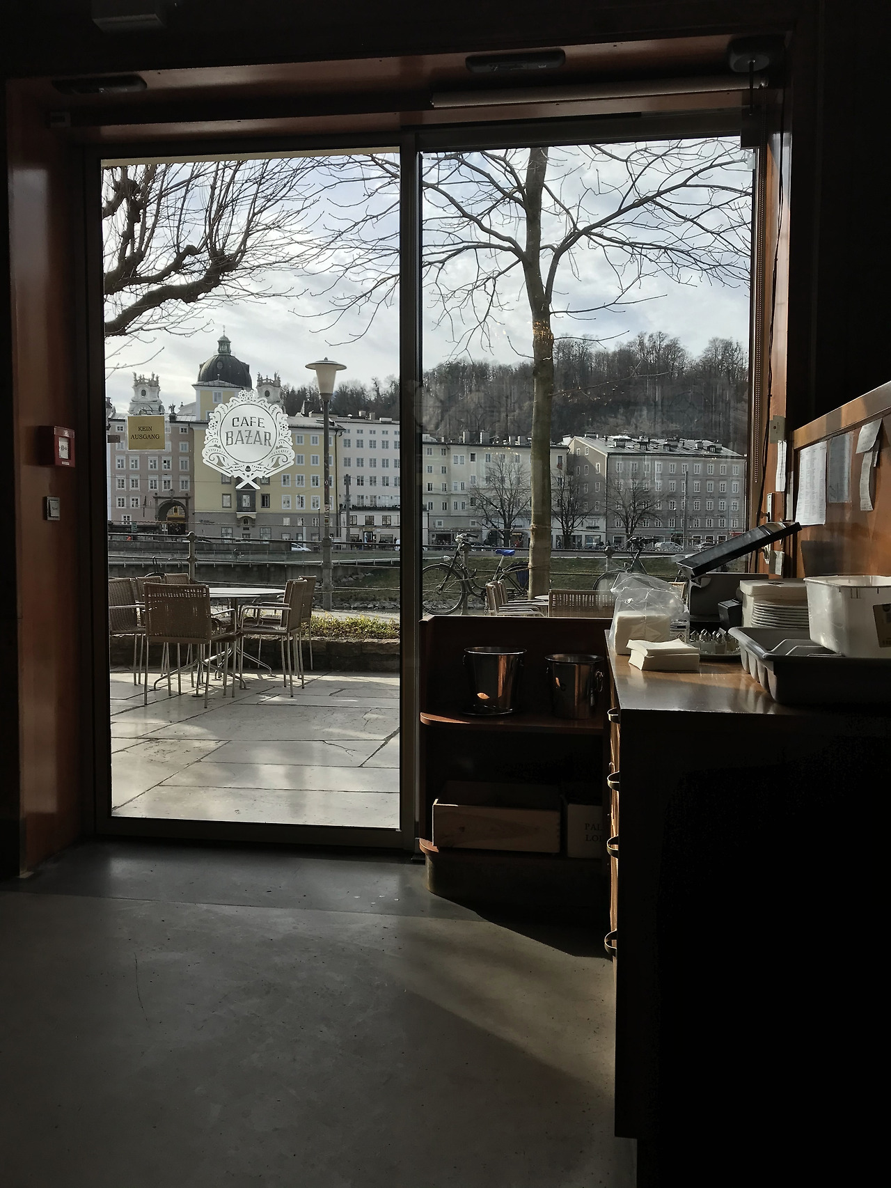 한숨 푹 자고 일어나서 외출 준비를 했다. 잘츠부르크에 왔으니 모닝송은 모차르트의 '플루트와 하프를 위한 협주곡'으로 산뜻하게 시작! 야간열차에서 준 조식으로 간단히 요기를 하고 오늘 하루 뭐할지 알아보았다. 첫 일정은 카페 Bazar에서 브런치 즐기기. 커피와 브런치를 즐기며 하루를 시작하는 사람들로 카페가 매우 북적거렸다. 잘츠부르크 강변에 위치한 테라스에서 브런치를 즐기고 싶었는데, 점심 준비로 테라스 이용이 제한되어서 어쩔 수 없이 안에 앉았다. 한쪽에는 나무 철을 한 오늘의 신문들이 걸려있고, 나이가 지긋한 중년의 신사들은 신문을 읽고 있었다. 여행자로 보이는 사람은 나뿐이었다. 눈이 마주치면 친절하게 웃어주는 사람들 덕분에 아직은 낯선 이곳도 왠지 따뜻한 곳일 것 같은 기분 좋은 예감이 들었다. 약간 어색하지만 최대한 자연스럽게 앉아있으려 노력하는, 그렇지만 어딘가 들떠 보이는 마음을 숨기지 못하는 영락없는 여행자로 보였겠지. 잘츠부르크 여행을 시작한다.