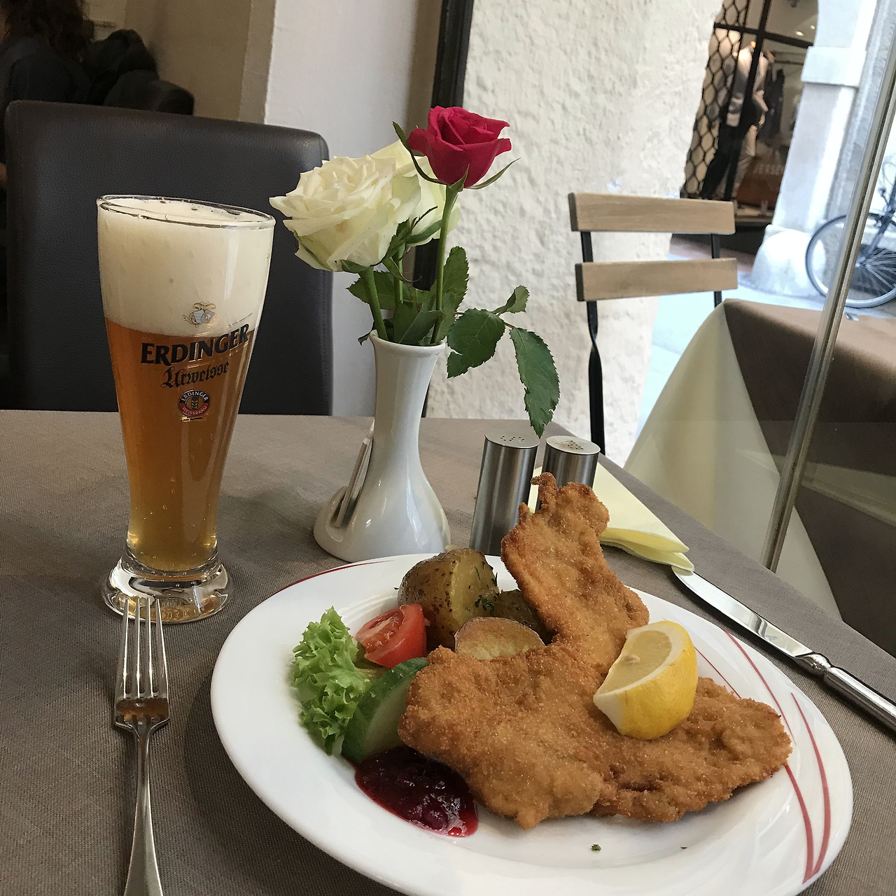 여기저기 걸어 다니며 구경하다가 모차르트 광장에서 잘츠부르크 카드를 구매하고 엄마랑 전화를 했다. 원래 점심은 패스하려고 했는데 '밥은 잘 먹고 다니냐'는 엄마의 걱정에 점심을 챙겨 먹기로 했다. 아기자기하고 예쁜 간판들이 가득한 게트라이데 거리에서 슈니첼 런치 할인이라는 입간판을 보고 한 식당에 들어갔다. 런치 할인 메뉴라길래 큰 기대 없이 시켰는데 정말 맛있었다! 슈니첼은 얇게 튀긴 돈가스 같은데 라즈베리 소스를 곁들이는 게 색달랐고, 직원이 추천해준 맥주도 아주 내 스타일이었다. 슈니첼 도전도 성공!