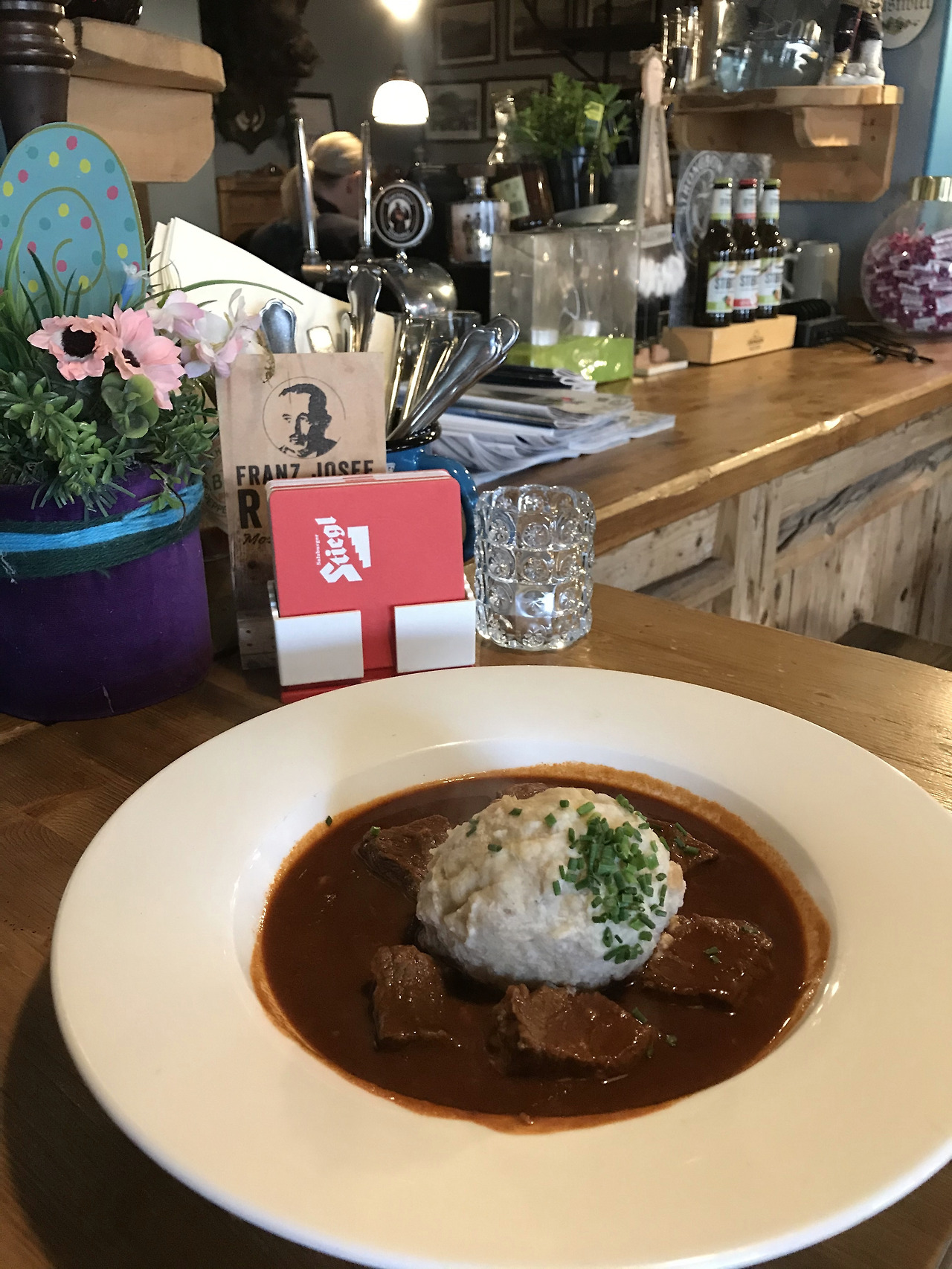 올 겨울 한국은 유독 따듯해서 눈을 한 번도 못 봤다. 그래서 이번 여행에서 이렇게 눈 쌓인 풍경을 꼭 보고 싶었는데, 잘츠부르크에서 볼 수 있을 줄이야! 정말 근사하고 멋졌다. 잘츠부르크 카드로 케이블카도 무료로 타고, 진짜 혜자 카드임! 케이블카가 중간에 갑자기 속도가 빨라지는 구간이 있는데 진짜 무서워서 주저앉을 뻔했다. 케이블에 내려서 시원한 바람을 맞으며 눈밭을 산책했다. 역시나 혼자 온 사람은 나뿐이었다. 한국인 한 그룹이 있었는데, 개인으로 신청해서 소규모 그룹으로 매칭 해주는 형태의 여행을 하는 것 같았다. 그중 한 여자분이 나한테 혼자 온 거냐며 대단하다고 자기도 나중에 꼭 혼자 오고 싶다고 해서 괜히 뿌듯했다. 혼자 여행하는 사람을 보면 왠지 당당하고 멋져 보였는데, 지금 내가 그런 모습일까 싶어서 약간 우쭐하고 기분이 좋아졌다. 운터스베르크의 짧은 겨울여행을 마치고, 피곤했는지 시내로 돌아오는 길에 버스에서 엄청 졸았다. 이 좋은 날 아름다운 풍경 하나도 놓치고 싶지 않아서 어떻게든 눈에 담고 싶었지만, 그야말로 꾸벅꾸벅- 해드벵잉 하며 졸았다. 점심은 맛집을 가보자 싶어서 트립어드바이저 순위가 높은 식당에 찾아가 굴라쉬를 먹어보았다. 한국 갈비찜 같기도 한데 약간 향신료 맛이 나서 이국적인 맛이 꽤 괜찮았다.