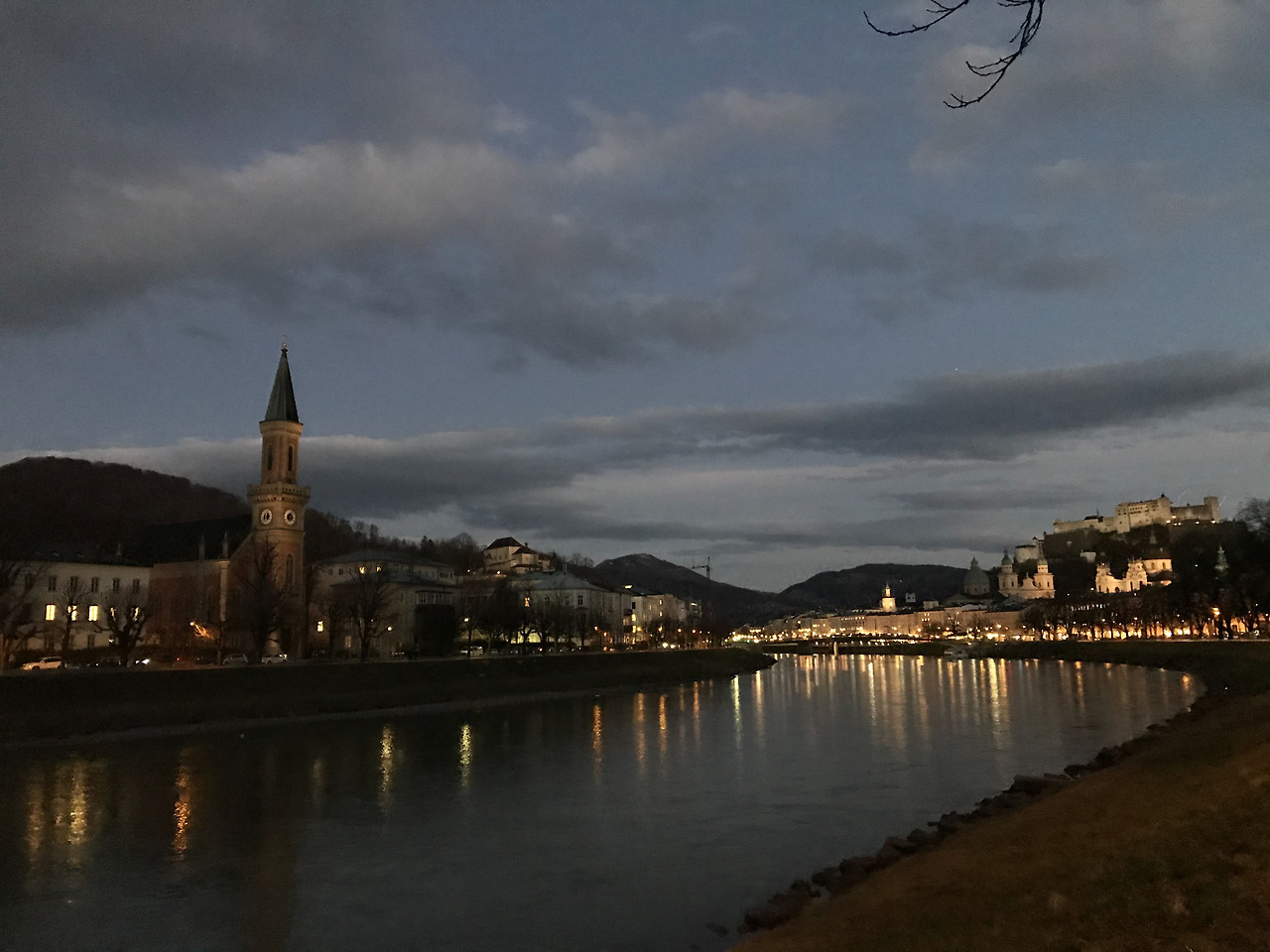오늘은 강변에서 일몰을 보고 싶어서 잘츠부르크 강을 따라 쭉 걸었다. 한 남자가 강변에 자리 잡고 앉아 혼자 담배를 피우며 와인을 먹고 있었다. 운치 있어 보이기보다 왠지 사연 있고 쓸쓸해 보였다. 너무 쓸쓸해 보여서 지나쳐 갔다가도 괜히 뒤돌아서 보게 되었다. 나는 마카르트 다리가 보이는 곳에 앉아 일몰을 보고 싶었다. 강변을 따라 자전거 타는 사람, 조깅하는 사람이 참 많았다. '여행지에서 조깅하기'도 이번 여행 버킷리스트 중 하나인데, 베를린 에어비앤비에 가면 꼭 해야지 다짐했다. (하지만 못 했다. 평소 조깅에 전혀 취미가 없었기 때문인지, 조깅이 버킷리스트였다는 것조차 까맣게 잊고 있었다.) 날씨가 쌀쌀해서 따뜻한 글뤼바인을 먹고 싶었다. 가게가 많은 강 반대쪽으로 다리를 건너갔다. 이제 무단횡단은 식은 죽 먹기. 싸구려 글뤼바인 한잔을 들고 다시 강변으로 돌아오니 가로등이 켜지기 시작하고 멀리서 종탑 소리가 들려온다. 오늘은 여기가 좋겠다! 한 벤치에 앉아 글뤼바인을 마시며 해가 완전히 질 때까지 한참을 앉아있었다. 근사한 노을은 아니었지만, 서서히 어둠이 깔리는 모습을 지켜보는 것도 꽤 좋았다. 늦은 시간에도 새소리가 들려왔다. 벤치에 앉아 한참을 멍 때리면서 종탑의 종소리를 몇 번이나 듣고서야 일어났다.