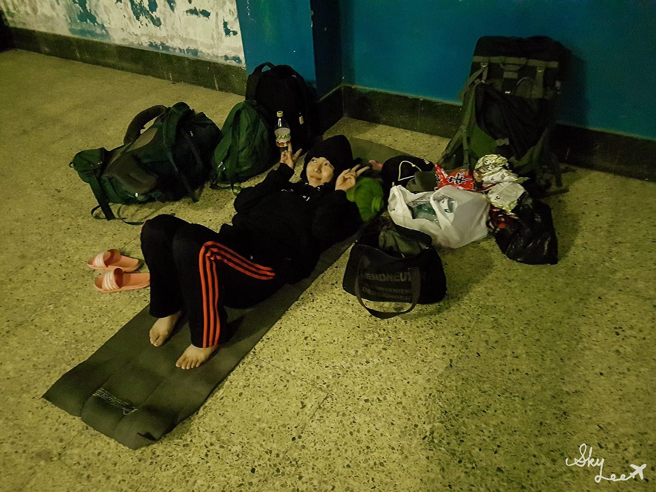 기차역에서 다른 사람들과 노숙을 청하는 중