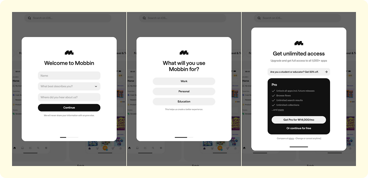 해당 화면은 앱과 웹사이트 스크린샷 아카이빙 사이트인 Mobbin의 회원가입 완료 후 나타나는 첫 웹페이지 화면이다.