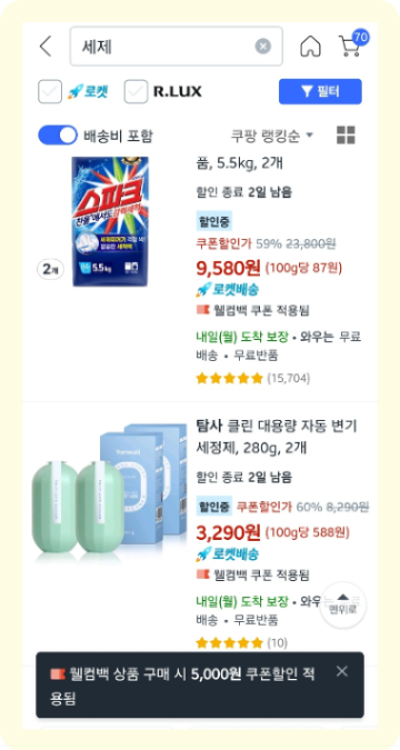 해당 화면은 Coupang에서 웰컴백 쿠폰을 받은 후 상품을 탐색하는 앱 화면이다.