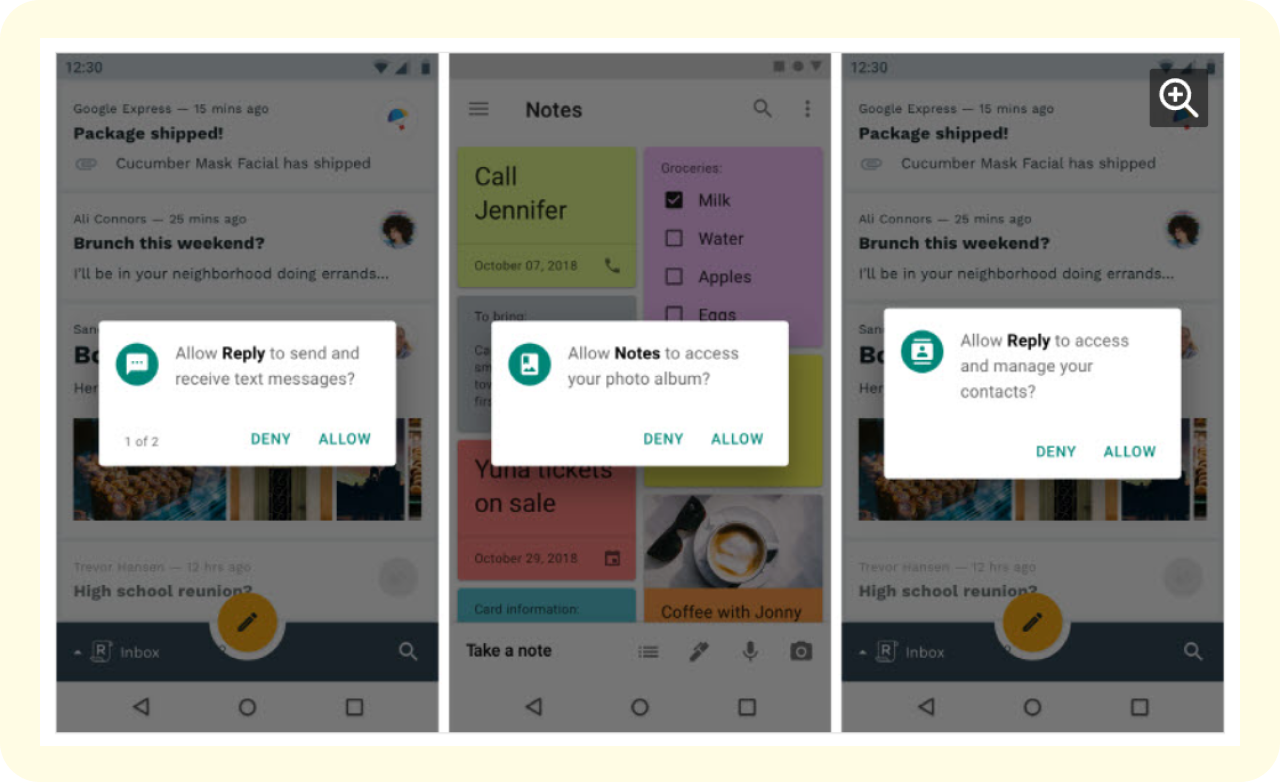 Reply와 Notes 기능을 필수로 선택하게 하고 있어 사용자가 원치 않아도 해당 접근에 동의해야 하며, 동의하지 않으면 해당 기능을 사용할 수 없다. 즉, 사용자에게 강제로 행동을 요구하여 불편을 제공한다.