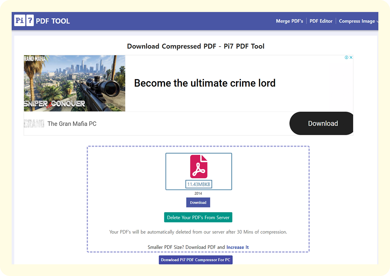 해당 화면은 다양한 파일의 병합을 도와주는 pi7PDF TOOL 웹사이트에서 파일 통합 완료 후 나타나는 화면이다.