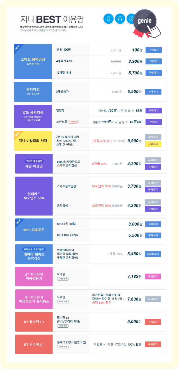해당 화면은 국내 음악 서비스인 Genie Music의 이용권 상세정보를 제공하는 웹사이트 화면이다.