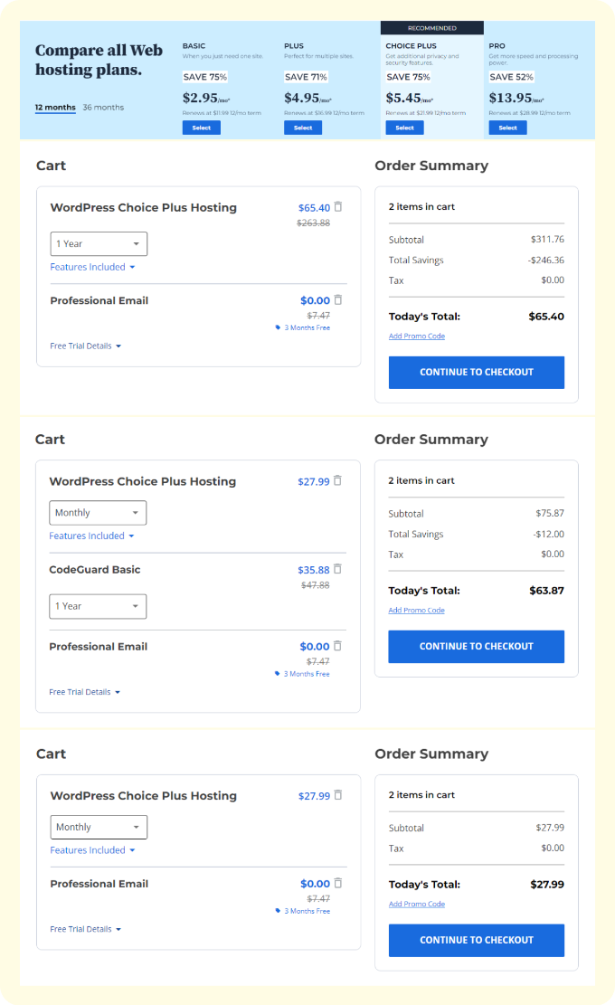 첫 화면에서 월 $5.45로 표시된 옵션을 선택했으나, 결제 페이지에서는 월 $5.45가 아닌 $65.40이 일시불로만 결제가 가능해 첫 번째 혼란을 겪었다. 이후 월별 결제로 변경했지만, 예상했던 $5.45가 아닌 $64.87이라는 금액이 나와 두 번째 혼란을 겪었다. 마지막으로 CodeGuard 옵션을 삭제했음에도 불구하고 월 요금은 여전히 $27.99로 책정되어, 결국 처음 제시된 금액인 월 $5.45가 아닌 월 $27.99로 결제를 진행해야 했다.