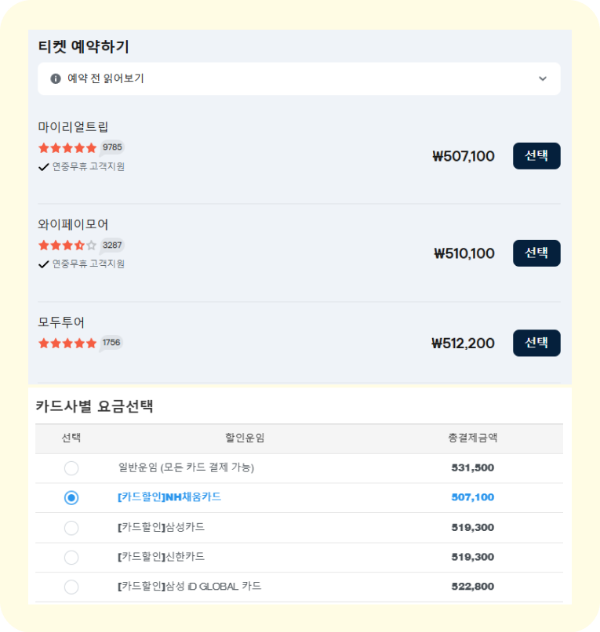 첫 번째 화면에서 마이리얼트립의 항공권 가격이 '507,100원'으로 표시되었으나, 결제 페이지로 이동하니 최종 결제 금액이 '531,500원'으로 변경되었다. 이는 특정 카드 사용자에게만 적용되는 할인 혜택이었던 것이다. 하지만 해당 혜택이 특정 카드에만 적용된다는 안내가 명확히 표시되지 않았고, 이로 인해 사용자는 처음에 낮은 가격으로 구매할 수 있을 것이라고 생각했지만 결제 단계에서는 더 높은 금액을 지불해야 하는 상황에 직면하게 되었다. 이러한 과정은 사용자에게 혼란을 주고, 불만족스러운 경험을 초래한다.