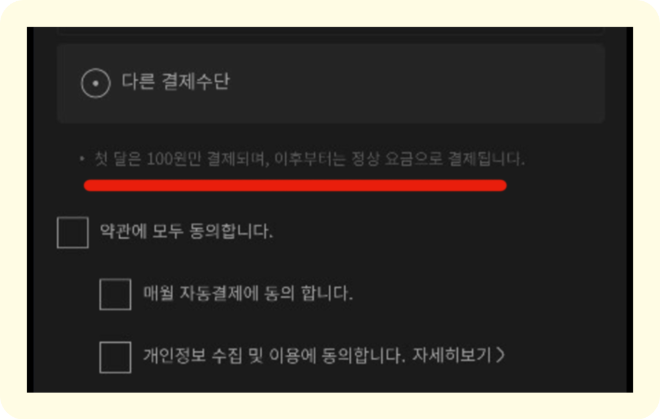 '첫 달은 100원만 결제되며, 이후부터는 정상 요금으로 결제됩니다.'라는 중요한 정보가 매우 흐린 색상으로 표시되어 있어 사용자가 쉽게 인지하지 못할 가능성이 크다. 또한, 사용자가 직접 동의할 수 있는 체크박스나 명확한 안내 옵션도 제공되지 않아, 첫 달 이후 자동으로 정상 요금이 결제된다는 사실을 놓칠 위험이 크다.