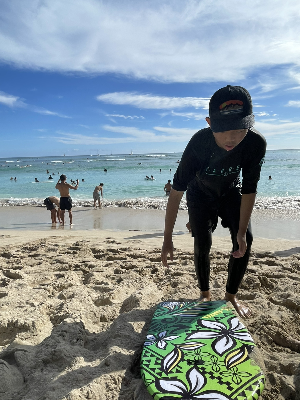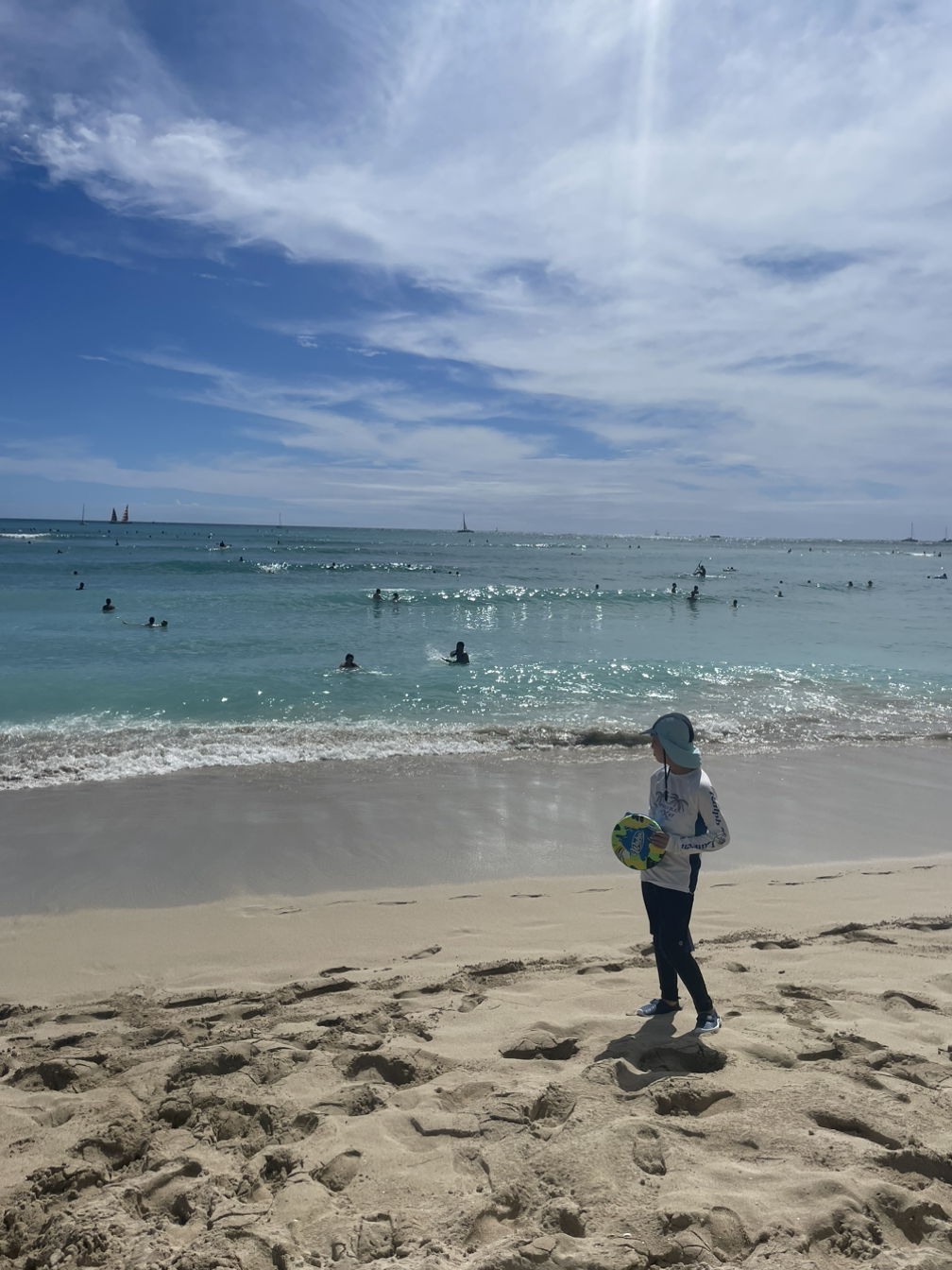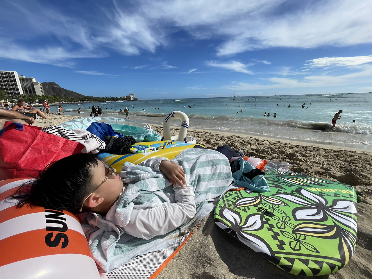 확실히 어린 아이들이 놀기에 와이키키는 편한 바다는 아니다. 아이들이 어리다면 알라모아나 쪽의 잔잔한 비치가 좋을 것 같다. 파도에 휩쓸리지 않을 정도의 키와 몸무게가 되어야 들어가서 놀 수 있을 것 같다. 그래서 둘째군은 와이키키에서는 거의 해변에 앉아서 타월을 뒤집어쓰고 나와 함께 감자칩을 먹으며 해변을 즐겼다.