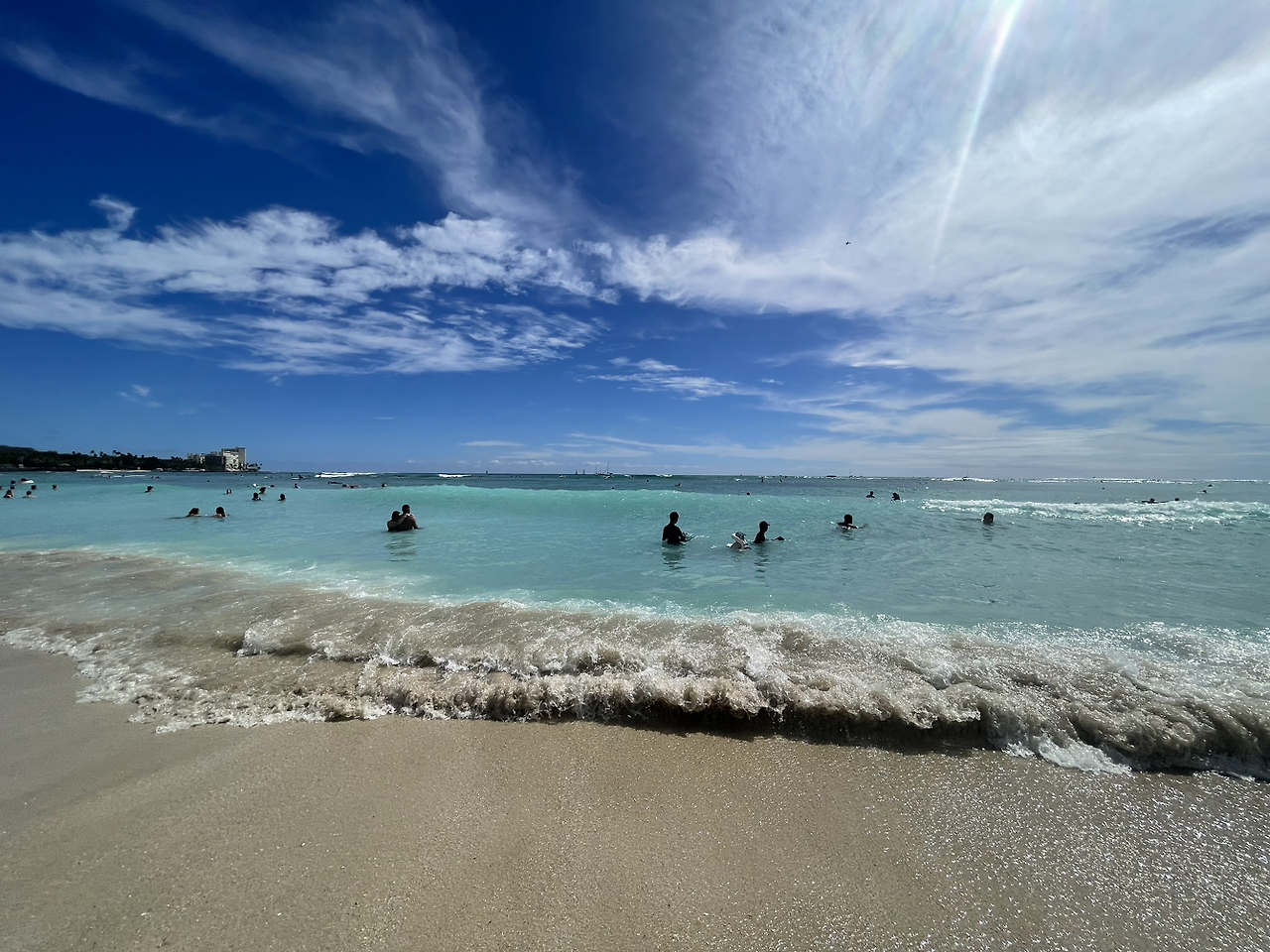 하와이를 대표하는 상징적인 명소. 서쪽의 카하나모쿠 비치를 시작으로 동쪽의 카이마나 비치까지 약 3.2km 해변. 쉐라톤프린세스카이울라니에서 작은 길 하나만 건너면 모아나 서프라이더 호텔이고 그 바로 앞에 와이키키 비치가 있다. 수영복을 입고 얼마든지 걸어갈 수 있는 거리. 돗자리를 가져가야 할까, 비치 파라솔이 필요하려나, 출발 전에는 고민이 많았는데 막상 가보니 다 필요 없다. 비치타월 한 장이면 된다. 한 장으로 둘둘 감고 있다가 바다에 들어갔다가 나와서 또 둘둘 감으면 그만. 누구든지 그냥 편하게 타월 한장 깔고 누워 있는 분위기다.