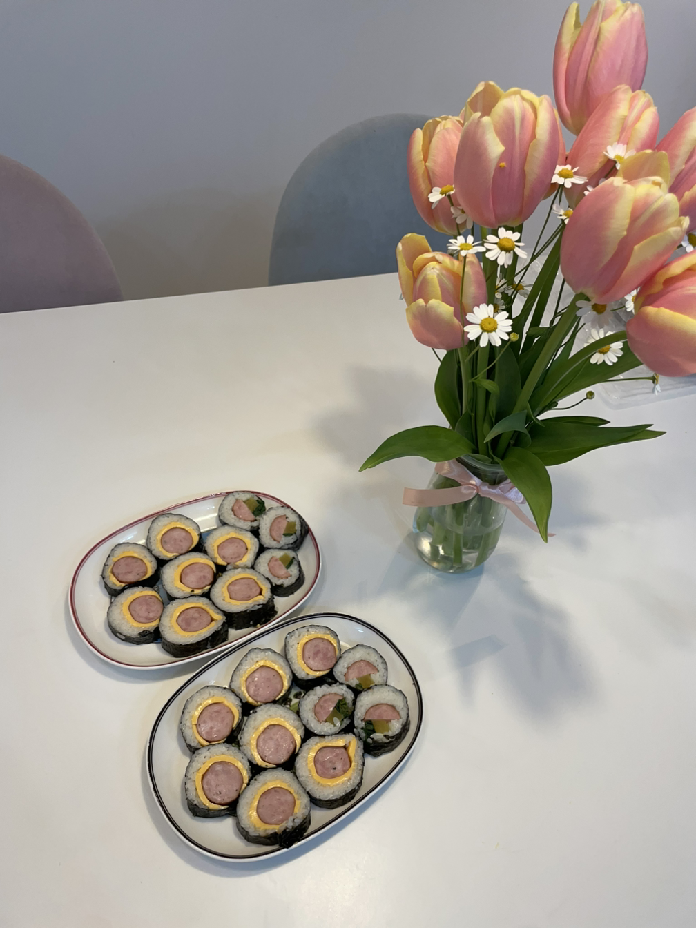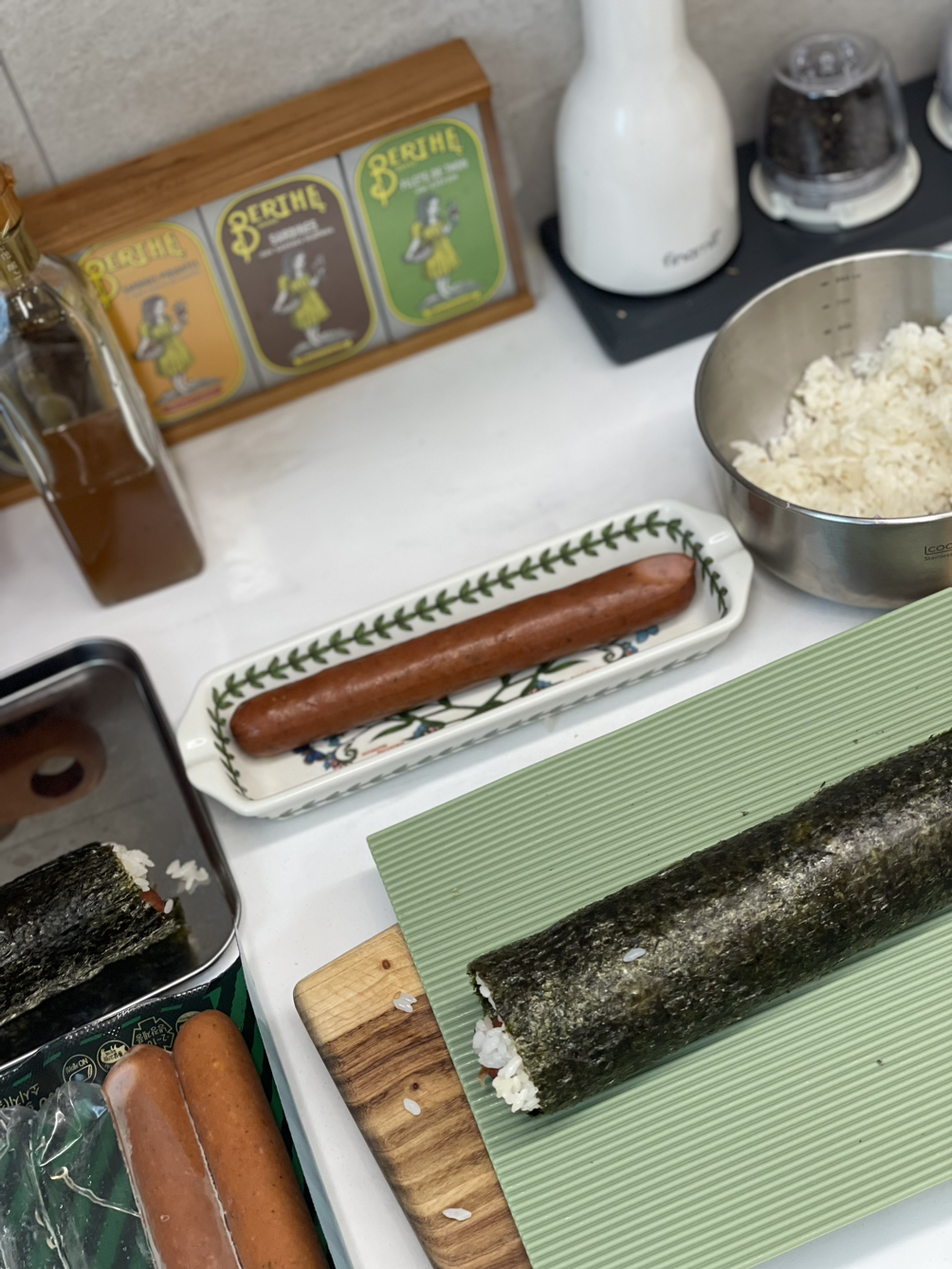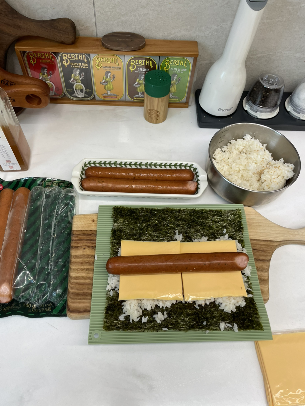 무엇보다도 이 아이가 가장 매력적인 것은 김밥 살때. 김밥 김에 길이가 딱 맞는다. 일반적인 김밥을 만들 때는 4등분해서 넣으면 적당한데 퇴근 후 급하게 아이들 저녁 먹여서 학원에 데려가야 하기에 하나씩 통째로 넣어 김밥을 만들었다. 밥에 소금 솔솔, 참기름 한바퀴 휙 둘러 살짝 양념한 후 김 위에 밥, 치즈 두 장, 전자렌지에 살짝 데운 소세지 넣고 둘둘 말면 동그란 김밥이 뚝딱 완성(급하게 싸다 보니 동그란 모양은 안나왔지만). 맛이 없을래야 없을 수 없는 조합.