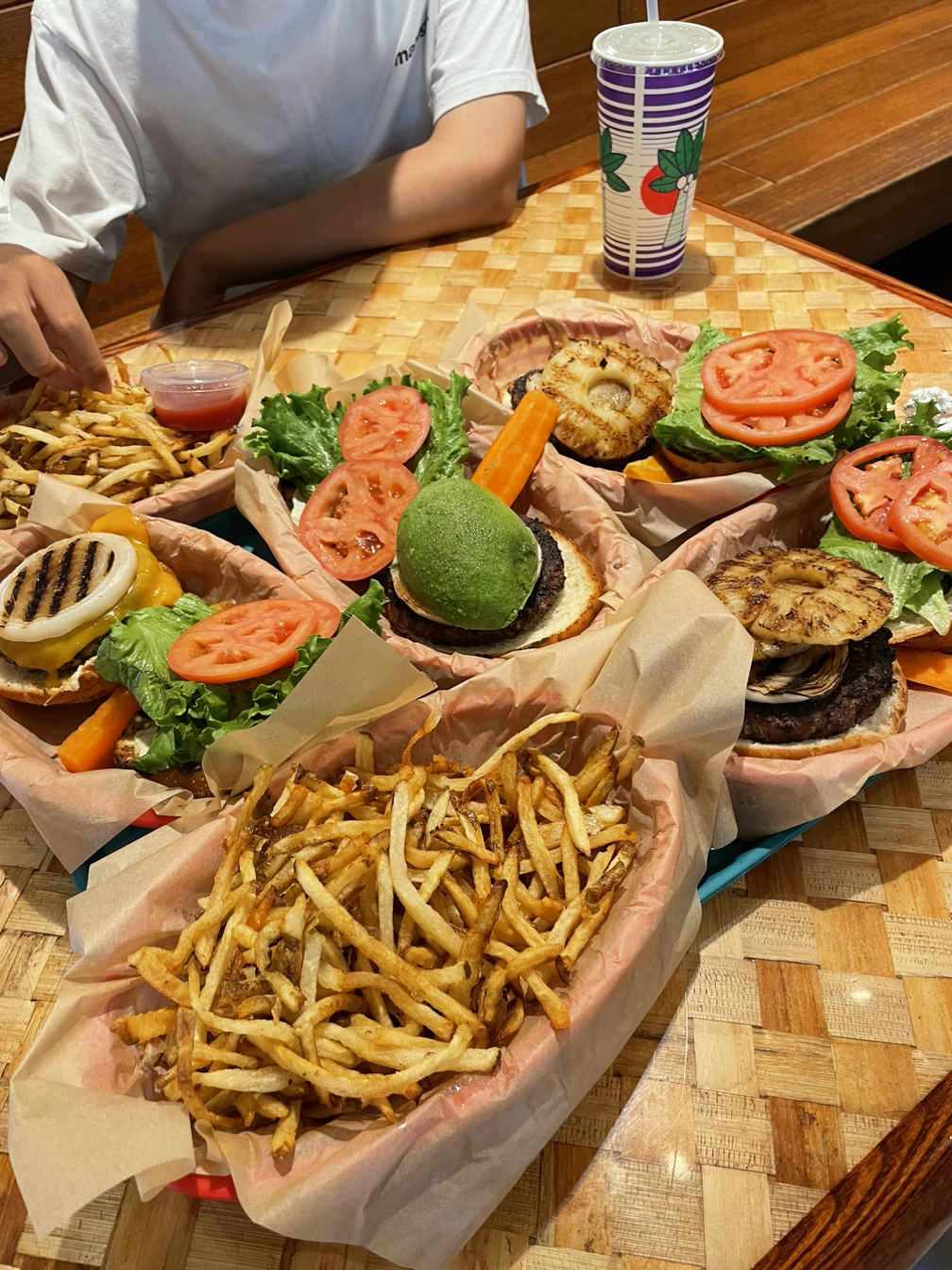 이제 진짜 북부 해변으로 올라간다. 늦은 점심을 먹기 위해 미리 찾아두었던 '쿠아아이나 (Kua Aina)' 수제 햄버거집으로 향했다. 테라스 자리의 분위기도 좋았지만 너무 더운 관계로 우리는 실내에 자리를 잡았다. 아보카도 버거와 파인애플 버거가 맛있다고 하여 주문. 그런데 한 가지 실수가 있었으니 인원수대로 4개를 시키니 양이 많아도 너무 많다. 게다가 저렇게 오픈해서 주니 더 많아보여서 쳐다만 봐도 벌써 배가 불러버린. 감자튀김도 저렇게 한바구니씩 나왔다. 햄버거 패티만한 아보카도가 통째로 올라와 있는 엄청난 스케일. 햄버거는 정말 맛있었고 감자튀김도 아주 맛있었다. 하지만 배가 불러도 너무 불러서, 숨도 제대로 못 쉴 것 같은 상태로 오후 내내 헉헉거렸으니. 양이 많지 않다면 인원수보다 조금 적게 주문하길. (우리 세남자분이 그래도 적게 먹는 분들은 아닌데)