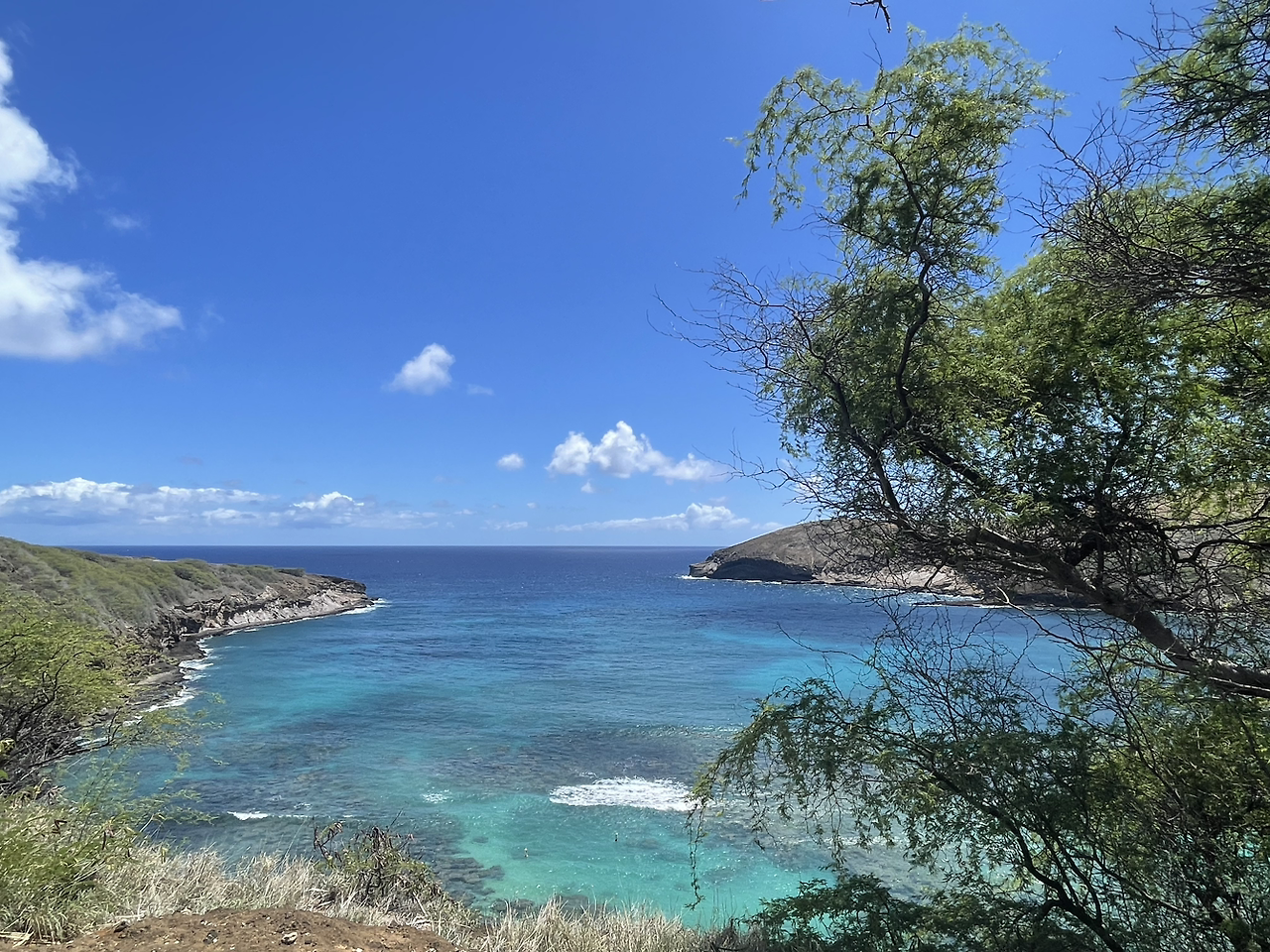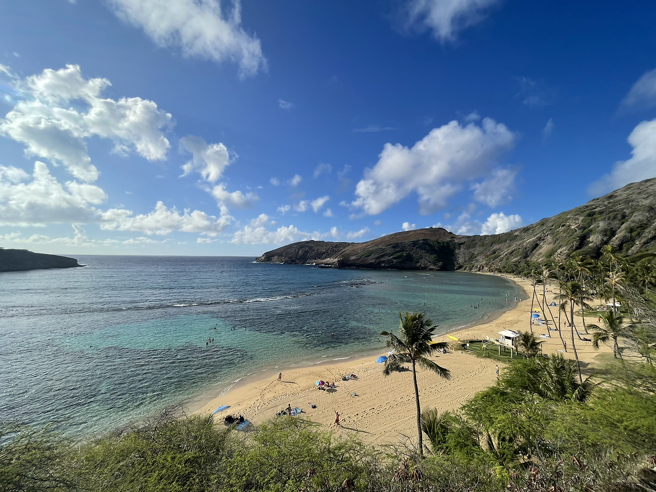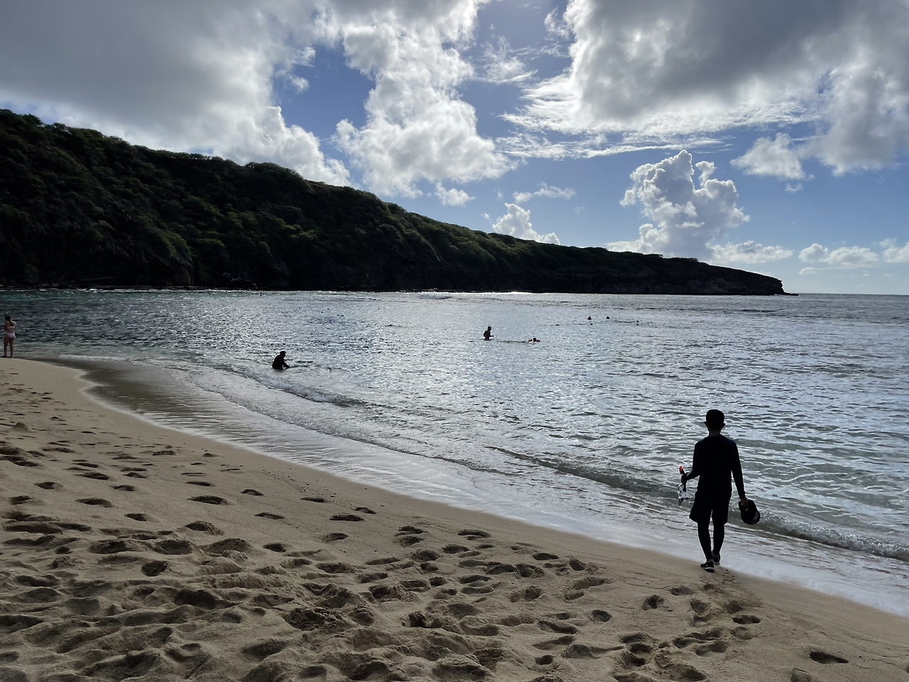 양손에 짐이 한가득 이었지만, 내려가면서 보이는 아름다운 풍경을 즐기겠노라며 트램을 타지 않고 굳이 걸어내려갔다. 아침부터 힘을 잔뜩 빼고. 사실 아무리 늦었어도 8시가 채 안된 시간이었으니, 이른 아침의 하나우마베이는 정말 그림같이 반짝반짝 아름다웠다.