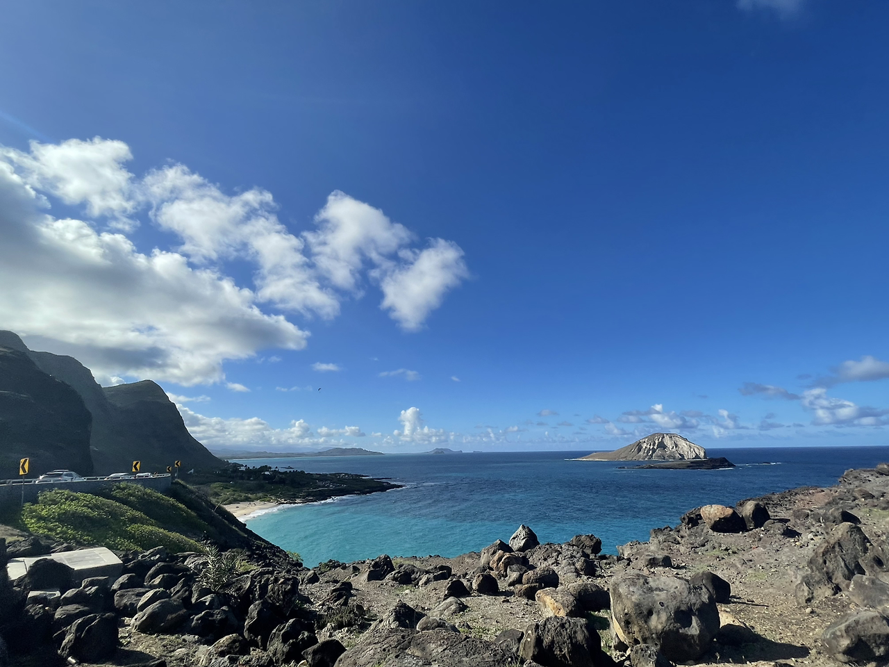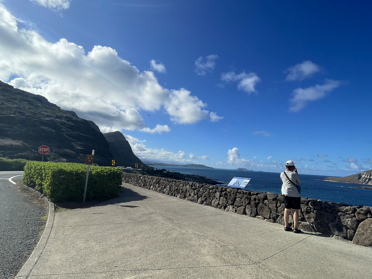 마카푸우 전망대는 오아후 섬의 가장 동쪽에 있는 포인트로 마카푸우 등대까지 하이킹하는 코스가 유명하다고 한다. 하지만 우리 가족은 걸을 의지가 1도 없는 상태. 등대까지 가지는 않고 전망대에서 바다를 바라보고 온 것만으로도 좋았다. 파란 하늘과 흰 구름, 검은산과 에메랄드빛 바다가 한 폭의 그림과 같다.