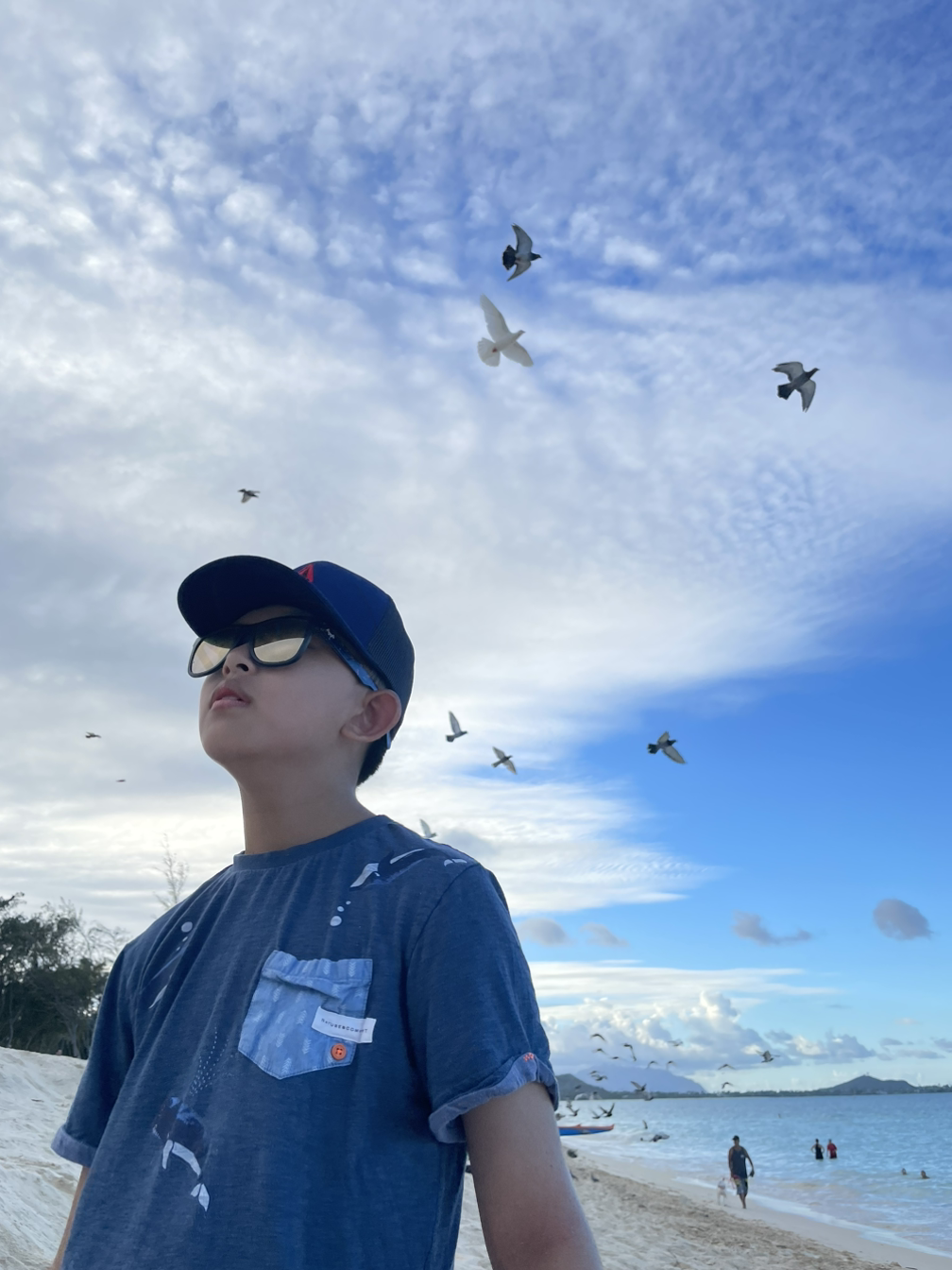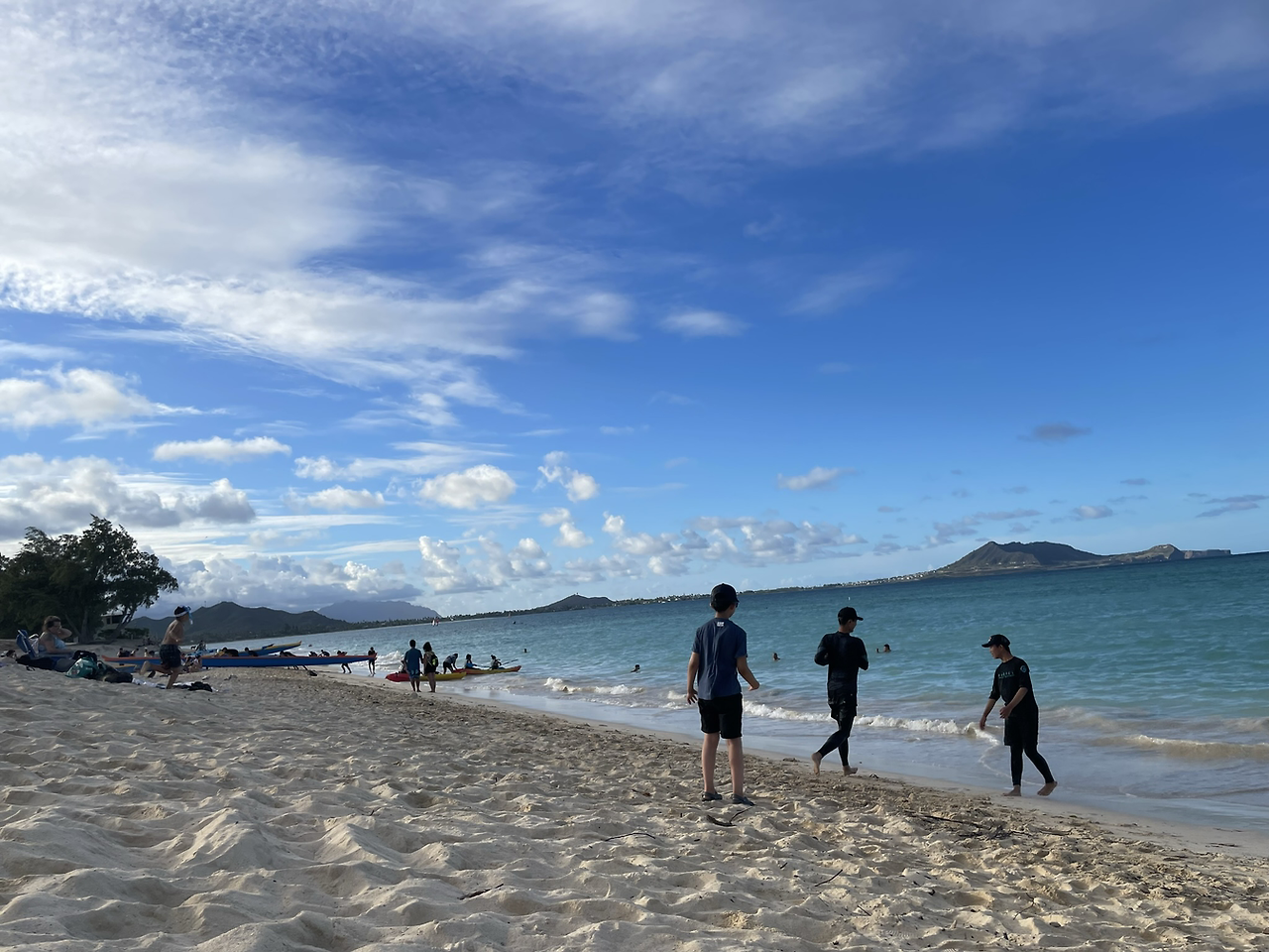 그렇게 해안도로를 따라 드라이브를 하면서 카일루아비치 까지 갔다. 사실 해변으로 치면 우리 가족은 이 해변이 가장 마음에 들어 했다. 평화로운 풍경. 잔잔한 바다. 고운 모래. 오후 시간이기도 했고 더 이상 수영할 계획은 없었기에 아이들은 해변에서 비치볼을 갖고 한참 놀았다. 나는 돗자리 펴고 앉아서 잠시 휴식. 물놀이 하는 어린 아가들도 있었고 카약을 타는 사람들도 있었는데 재미있어 보였다.
