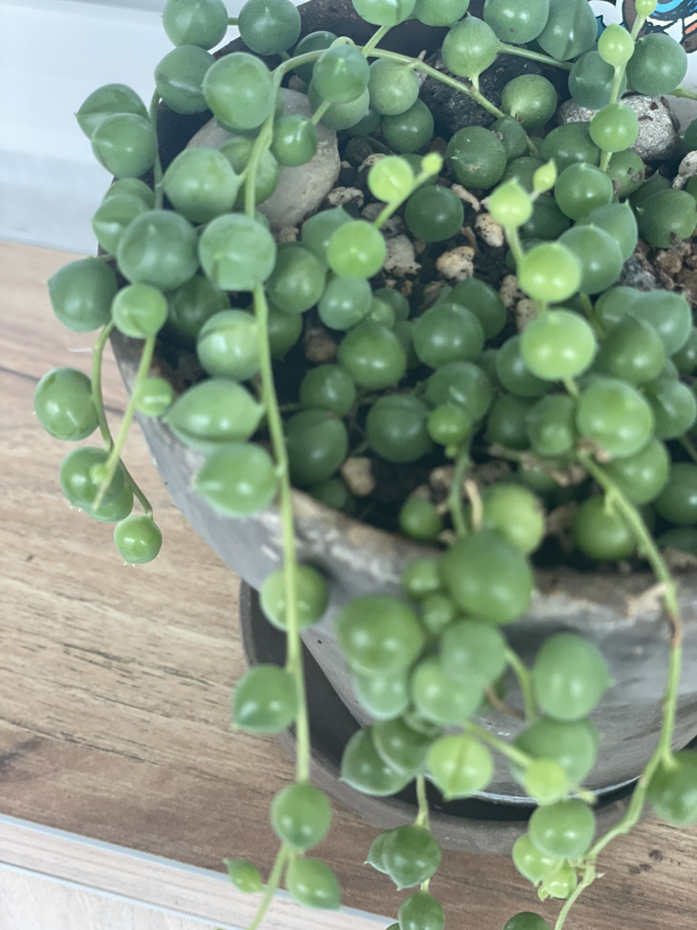 색깔이 초록이어서 완두콩 갔다고 하지만 어찌보면 구슬 목걸이 같기도 하다. 외국에서는 진주목걸이라는 표현을 쓴다고도 한다. 콩알처럼 동그란 것은 열매가 아니라 잎이다. 참 신기한 다육이의 세계.